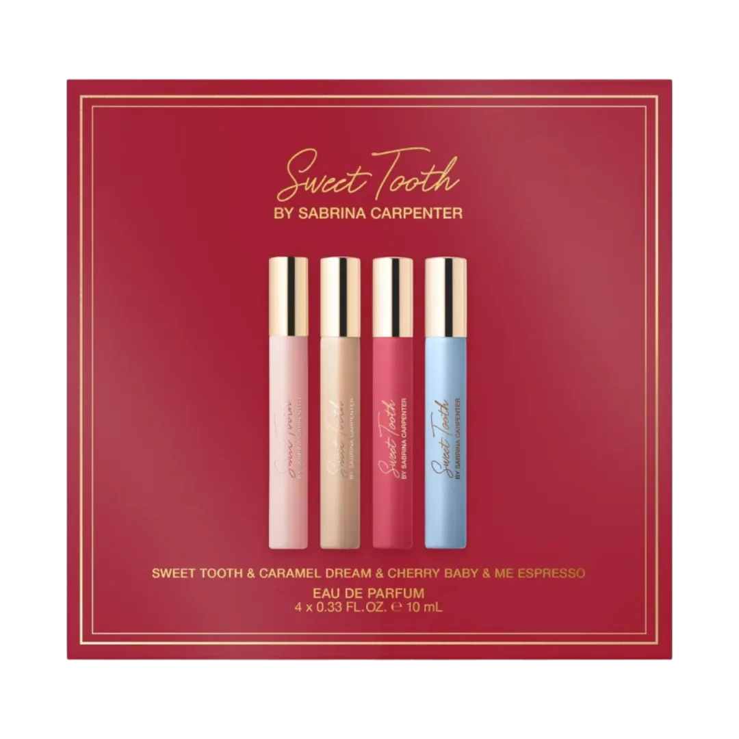 Відкрийте для себе смачний світ ароматів Сабріни Карпентер за допомогою цього чарівного подарункового набору для подорожей, що містить 4 спреї по 10 мл усіх ароматів Sweet Tooth колекції, які підходять для веганів та не тестуються на тваринах.