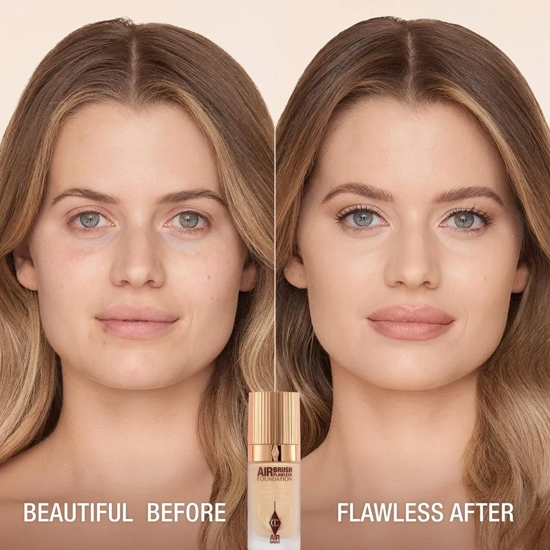 Матова, не плоска, розмиваюча основа Airbrush Flawless Foundation від Charlotte Tilbury забезпечує повне покриття та контроль блиску протягом 24 годин.