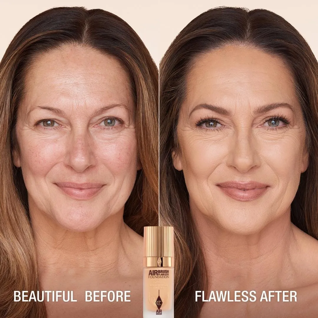 Матова, не плоска, розмиваюча основа Airbrush Flawless Foundation від Charlotte Tilbury забезпечує повне покриття та контроль блиску протягом 24 годин.