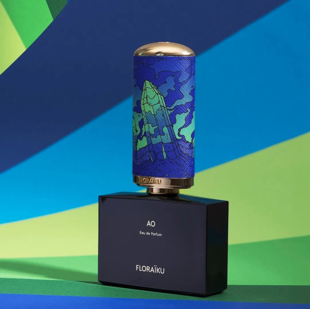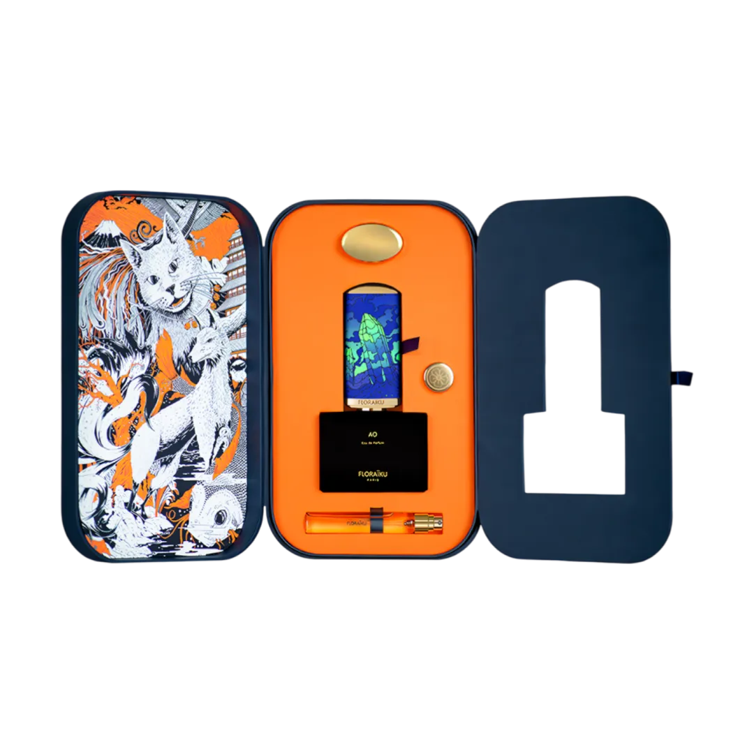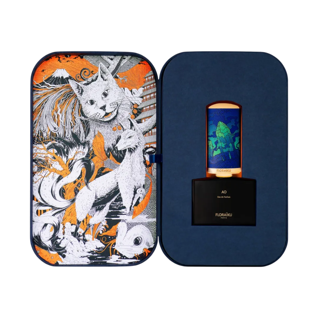 AO в Японії означає колір між синім і зеленим, відтінок, що змінюється. Точно так, як це роблять дорогоцінні камені, залежно від світла і чистоти каменю. Тут вони стоять, ограновані, як аромат, розкриваючи цілу гаму тонких нюансів.