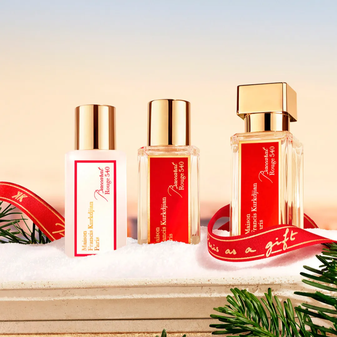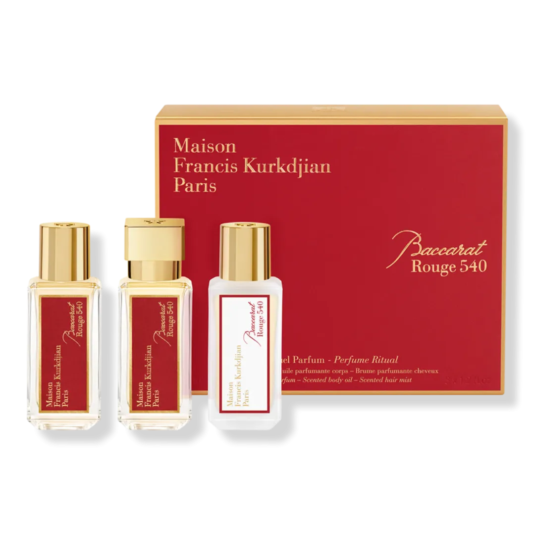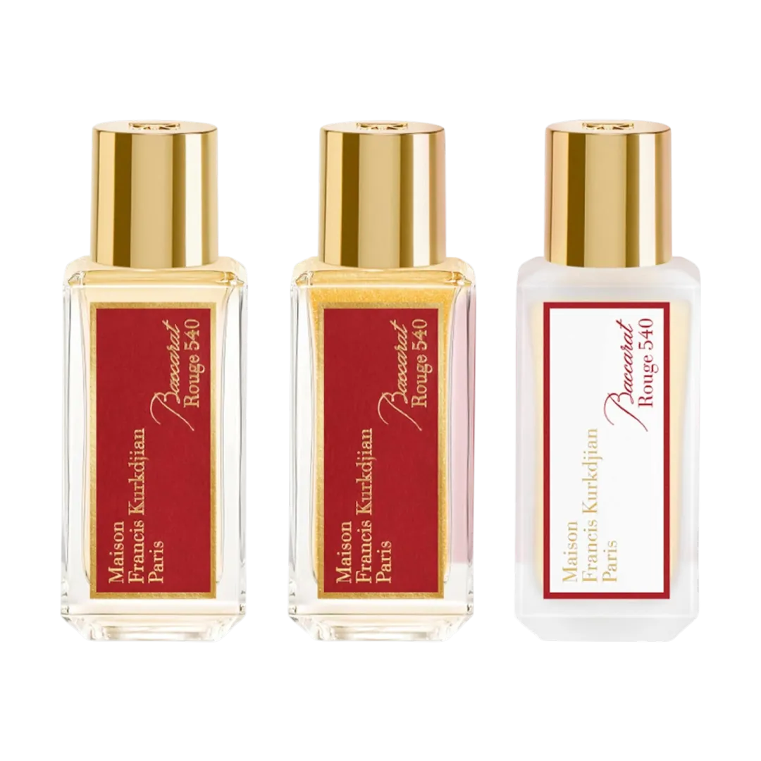 Неповторний аромат Baccarat Rouge 540 розкриває свої квіткові, амброві та деревні ноти у трьох продуктах: парфумованій воді, ароматизованій олії для тіла та ароматизованому спреї для волосся, всі три у форматі 35 мл, зручному для подорожей.