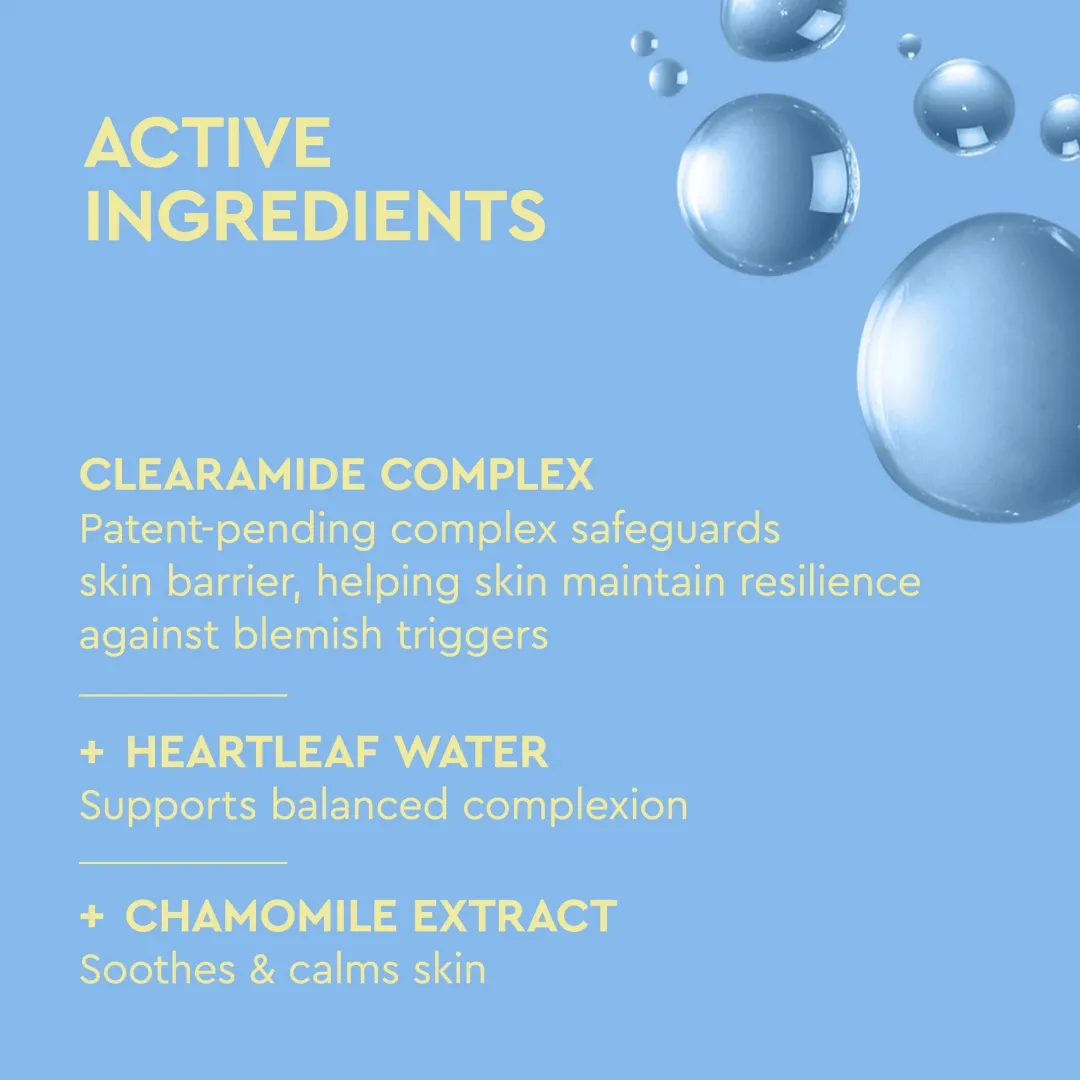 Патентований Clearamide Complex™ зміцнює природний захист шкіри, підтримує бар’єр і запобігає втраті вологи — що є ключем до стійкості шкіри перед факторами, які спричиняють висипання.