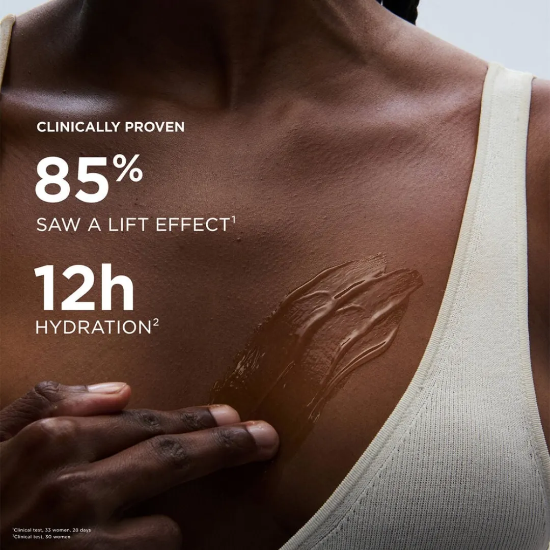 Високоефективний гель для підтяжки, розроблений для видимого підтягування, формування та ущільнення тонкої, делікатної шкіри грудей та декольте. Створений для боротьби з наслідками коливань ваги та вагітності, а також з видимими ознаками старіння в області грудей, включаючи в'ялість, зменшення щільності та втрату пружності. Цей надзвичайно ніжний засіб містить НОВИЙ ексклюзивний комплекс трипептиду + екстракту насіння серцевини; трипептид підтримує колаген для помітного зміцнення шкіри, а органічний екстракт насіння серцевини розгладжує шкіру та покращує її еластичність, створюючи ефект підтяжки. Освіжаючий рожевий гель перетворюється на приємну, еластичну, сітчасту текстуру, яка швидко висихає, створюючи природний ефект бюстгальтера для миттєвої підтяжки.