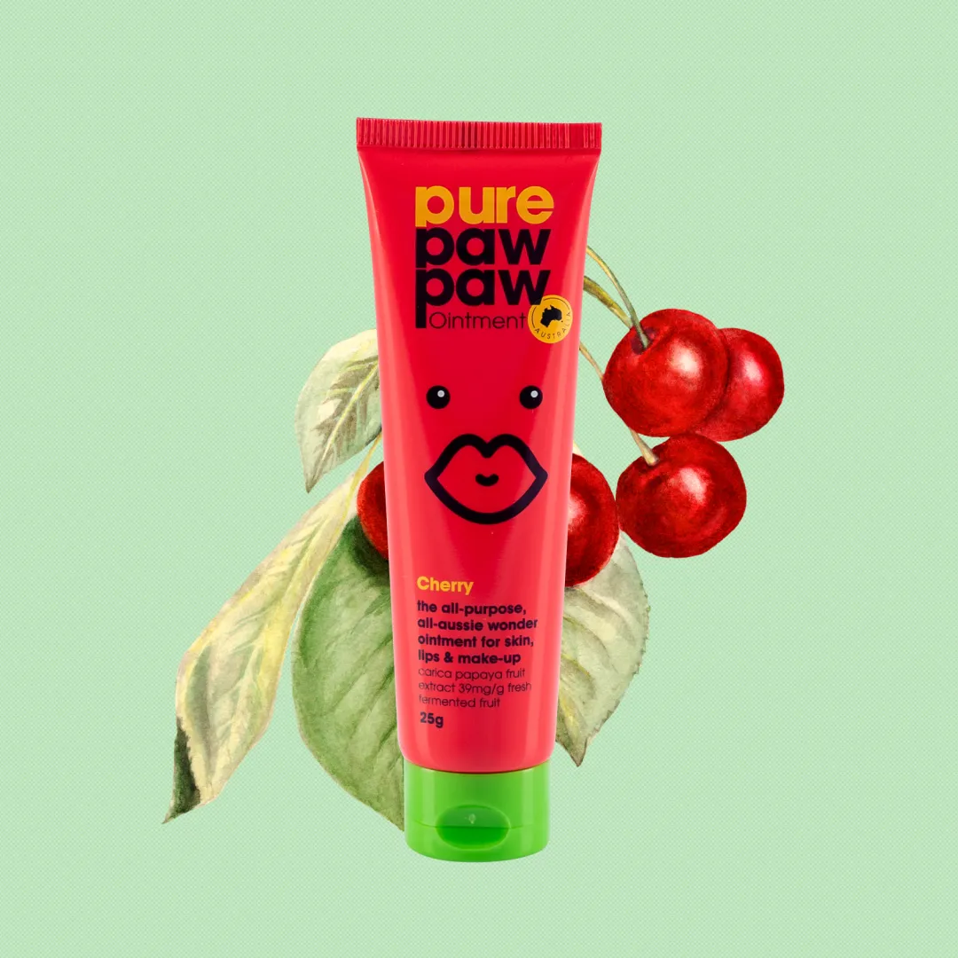 Ідеальний догляд за сухою та подразненою шкірою губ знайдено! Це бальзам для губ Cherry від бренда Pure Paw Paw. Основа його формули - ферментована папайя, а аромат нагадує соковитий запах стиглої вишні. Цей косметичний продукт швидко та ефективно лікує ніжну шкіру, відновлюючи ушкоджену структуру її клітин. Завдяки цілющому впливу папаїну ваші губи знову стануть м'якими і ніжними.