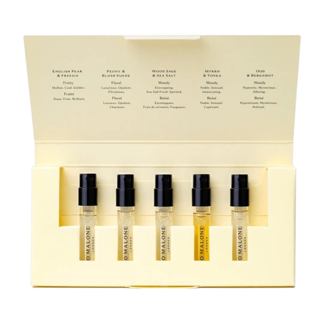 Відкрийте для себе новий улюблений аромат серед п’яти пробних варіантів. Колекція Discovery Collection включає м’який аромат «English Pear & Freesia», кокетливий «Peony & Blush Suede», свіжий «Wood Sage & Sea Salt», чуттєвий «Myrrh & Tonka» та гіпнотичний «Oud & Bergamot». Кожен з них можна носити окремо або поєднувати з іншим у рамках концепції «Scent Pairing».