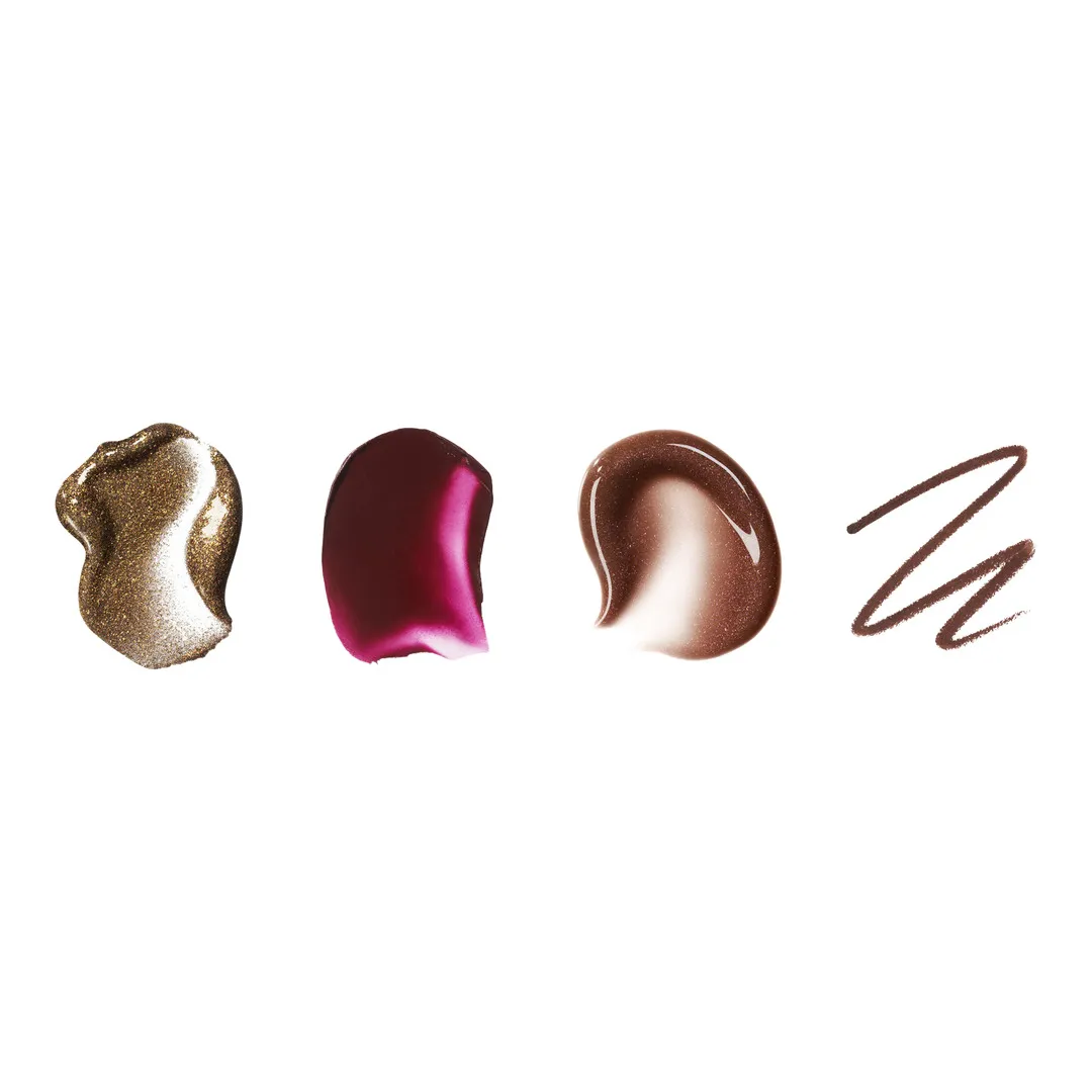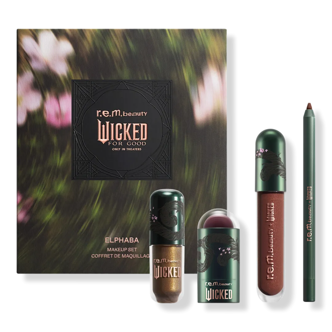 Набір r.e.m. beauty x Wicked: For Good Elphaba Makeup Set має все необхідне, щоб створити образ, натхненний її магічною та могутньою енергією. Рідкі тіні у глибокому лісово-зеленому відтінку з коричневим і шампань-перламутровим переливом вкривають повіки сяючим кольором. Нанеси рум’яна та помаду для легкого відтінку сяючої сливової гами, що зволожує шкіру. Завершуй образ насиченим шоколадно-коричневим олівцем для губ, а зверху додай шар теплого коричневого блиску-бальзаму з зачаровуючим сливовим відблиском. Створи сміливий і виразний лук — або ніжний відтінок кольору на щодень.