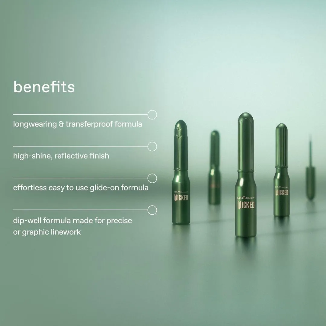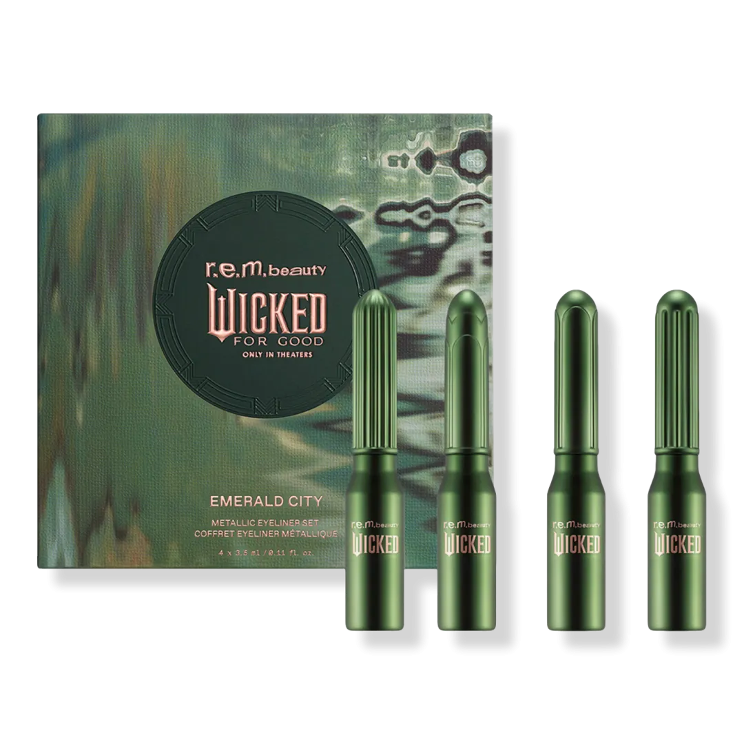 Лімітований набір r.e.m. beauty x Wicked: For Good — це колекція підводок-лайнерів із металевим сяйвом у найулюбленіших відтінках краї Оз: від холодного срібла до теплого бронзового, із переосмисленим золотим та металевим лісово-зеленим. Створені для максимальної точності та творчості, ці лайнері дозволяють втілювати все — від сміливих графічних образів до витончених, делікатних ліній.