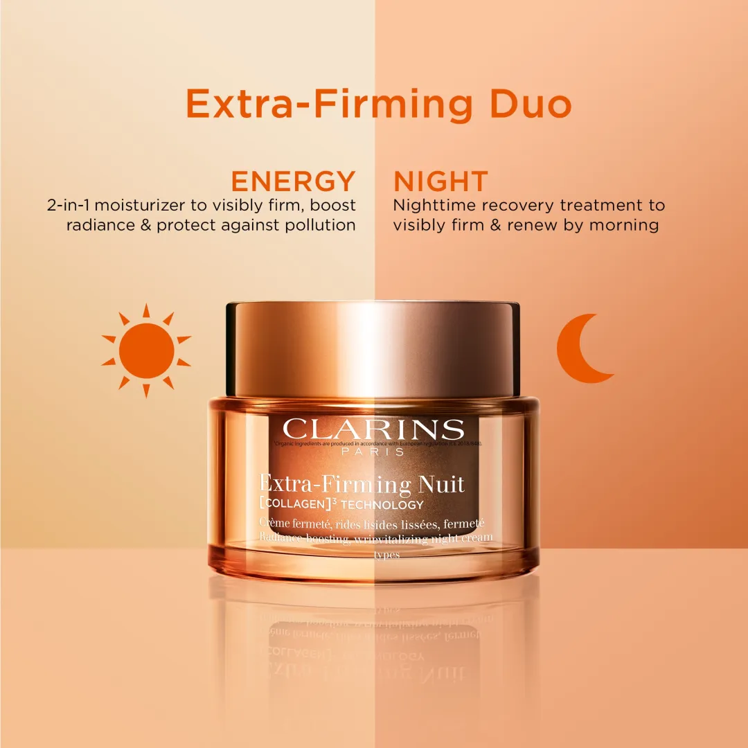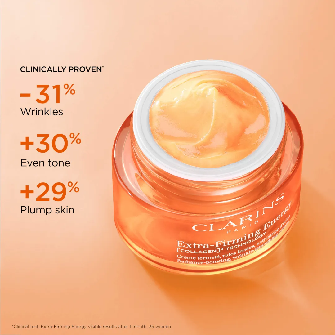 Extra-Firming Energy — високоефективний щоденний зволожуючий крем проти старіння, який використовує останні досягнення науки і природи для впливу на три ключові показники пружності шкіри: розгладження зморшок, підтягування шкіри та корекція контурів обличчя, одночасно оживляючи тьмяний, втомлений колір обличчя. Шкіра стає помітно пружнішою і сяючою вже за 7 днів.