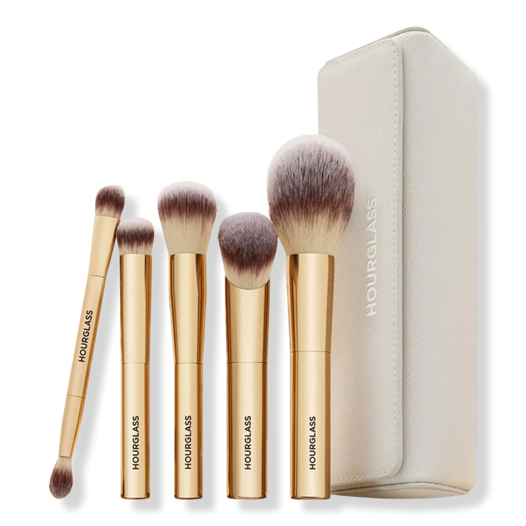 Познайомтесь із найкращим тревел-набором пензлів — колекцією культових інструментів для обличчя та новим двостороннім пензлем для очей у компактному форматі. Усі пензлі представлені в святковому золотому оздобленні, створеному ексклюзивно для Holiday 2025, і упаковані у стильну косметичку з веганської саф’янової шкіри.