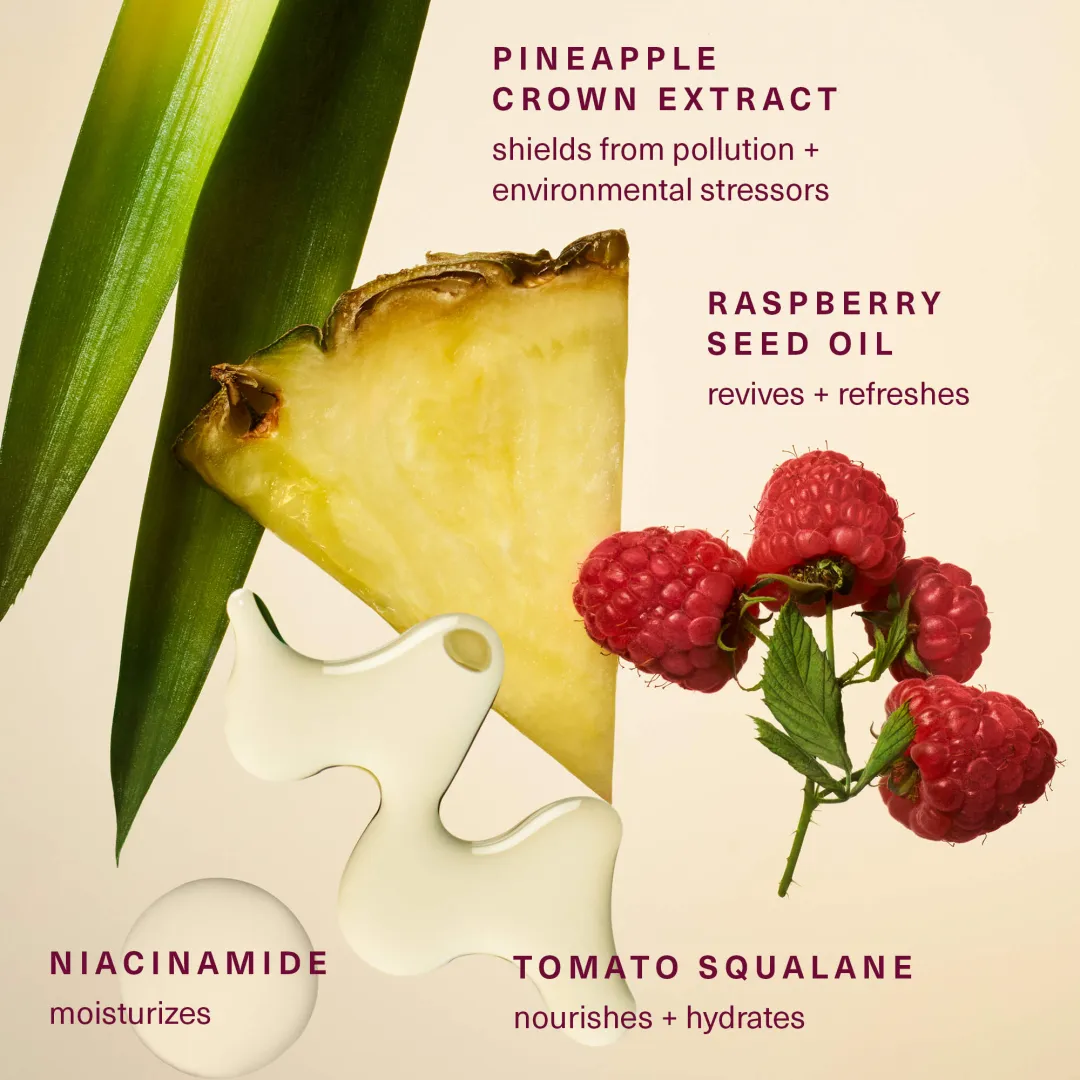 Water (Aqua/Eau), Fragrance (Parfum), Caprylic/Capric Triglyceride, Butylene Glycol, Coco-Caprylate/Caprate, Glycerin, Alcohol, Niacinamide, Polycitronellol, Pentylene Glycol, Methylpropanediol, Pyrus Malus (Apple) Seed Oil, 1,2-Hexanediol, Sodium Chloride, Chlorella Vulgaris Extract, Glucose, Fructooligosaccharides, Fructose, Ananas Sativus (Pineapple) Fruit, Yeast Polysaccharides, Ethylhexylglycerin, Lactobacillus Ferment, Sodium Phytate, Prunus Persica (Peach) Flower Extract, Citric Acid, Withania Somnifera Root Extract, Sodium Benzoate, Biotin, Raspberry Seed Oil/Tocopheryl Succinate Aminopropanediol Esters, Squalane, Tocopherol, Solanum Lycopersicum (Tomato) Fruit Extract, Linalyl Acetate, Limonene, Citrus Aurantium Bergamia (Bergamot) Peel Oil, Benzyl Salicylate, Hydroxycitronellal, Alpha-Isomethyl Ionone, Linalool, Citronellol, Pinene, Citrus Aurantium Peel Oil, Terpinolene, Eugenol, Citral, Terpineol, Beta-Caryophyllene, Geranyl Acetate, Alpha-Terpinene, Geraniol.