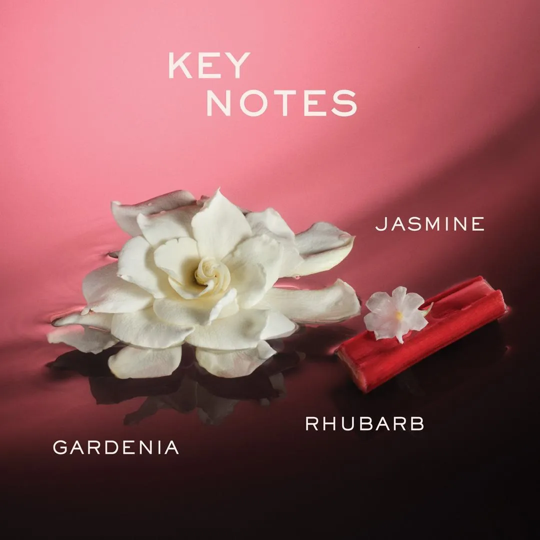 Свіжий квітково-гурманський аромат, що розквітає нотами ревеню та яскравих фруктів, плавно переходить у ніжну суміш огортаючого жасмину та гарденії, а потім завершується м’яким шлейфом ванілі та кашемірового дерева. Збагачений зволожуючою трояндовою водою, що надає шкірі тонусу та м’якого відчуття свіжості.