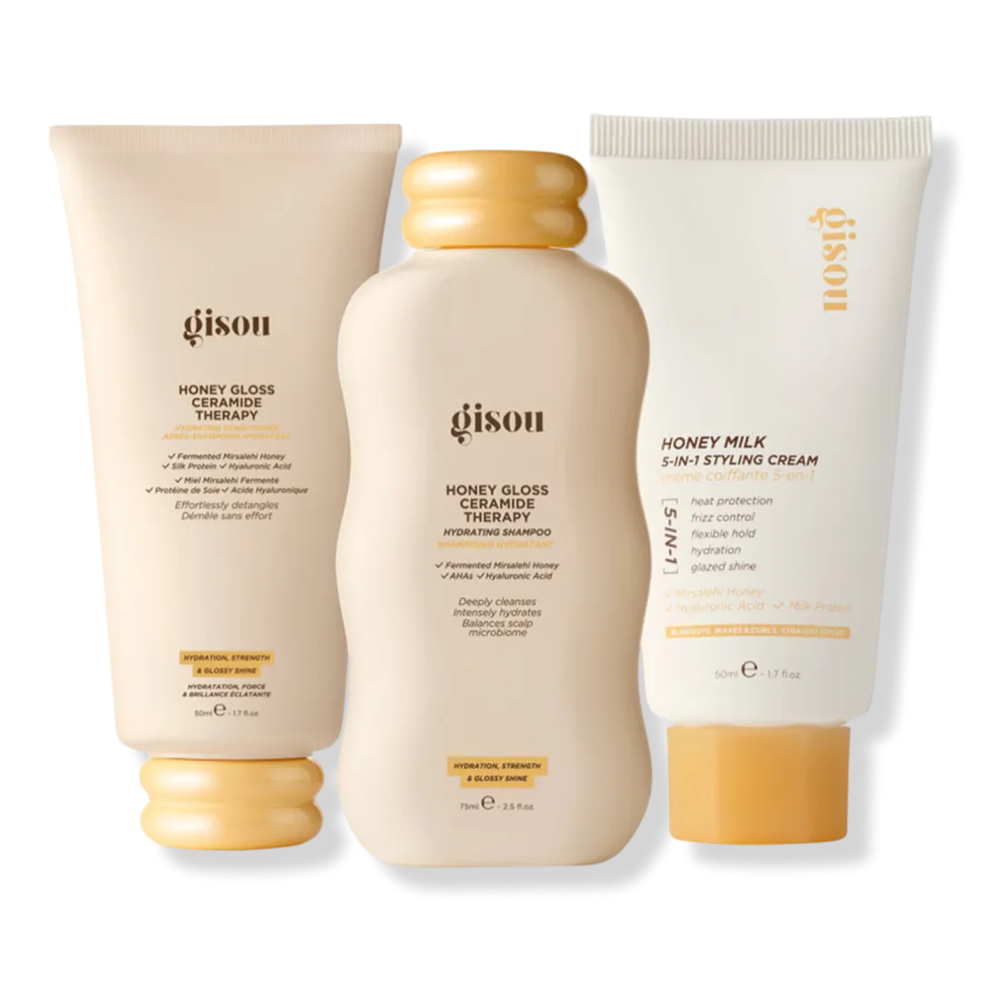 Підготуйте, догляньте та вдоскональте свій вигляд у дорозі за допомогою набору для укладання волосся у форматі для подорожей, що включає міні-шампунь та кондиціонер Honey Gloss і міні-крем для укладання волосся 5-в-1 Honey Milk.