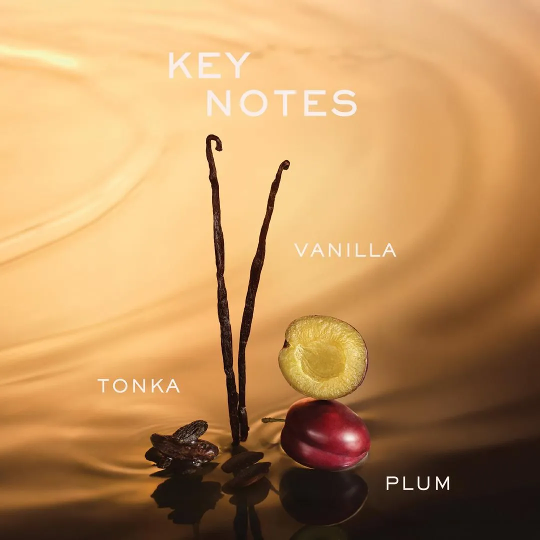 Огортаючий бурштиновий аромат гурманського типу, в основі якого лежить кремове тепло. Вступ із нот стиглої сливи та насичених спецій плавно переходить у м'яку композицію, яка завершується карамелізованими нотами бобів тонка, ванілі та кедра. До складу входить зволожуюча кокосова вода, яка робить шкіру м'якою та освіженою.