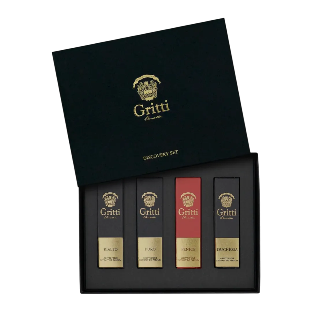 Відкрийте для себе світ Gritti Privé завдяки набору пробників в елегантній чорній коробці, прикрашеній логотипом бренду.