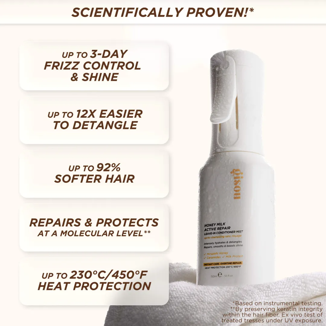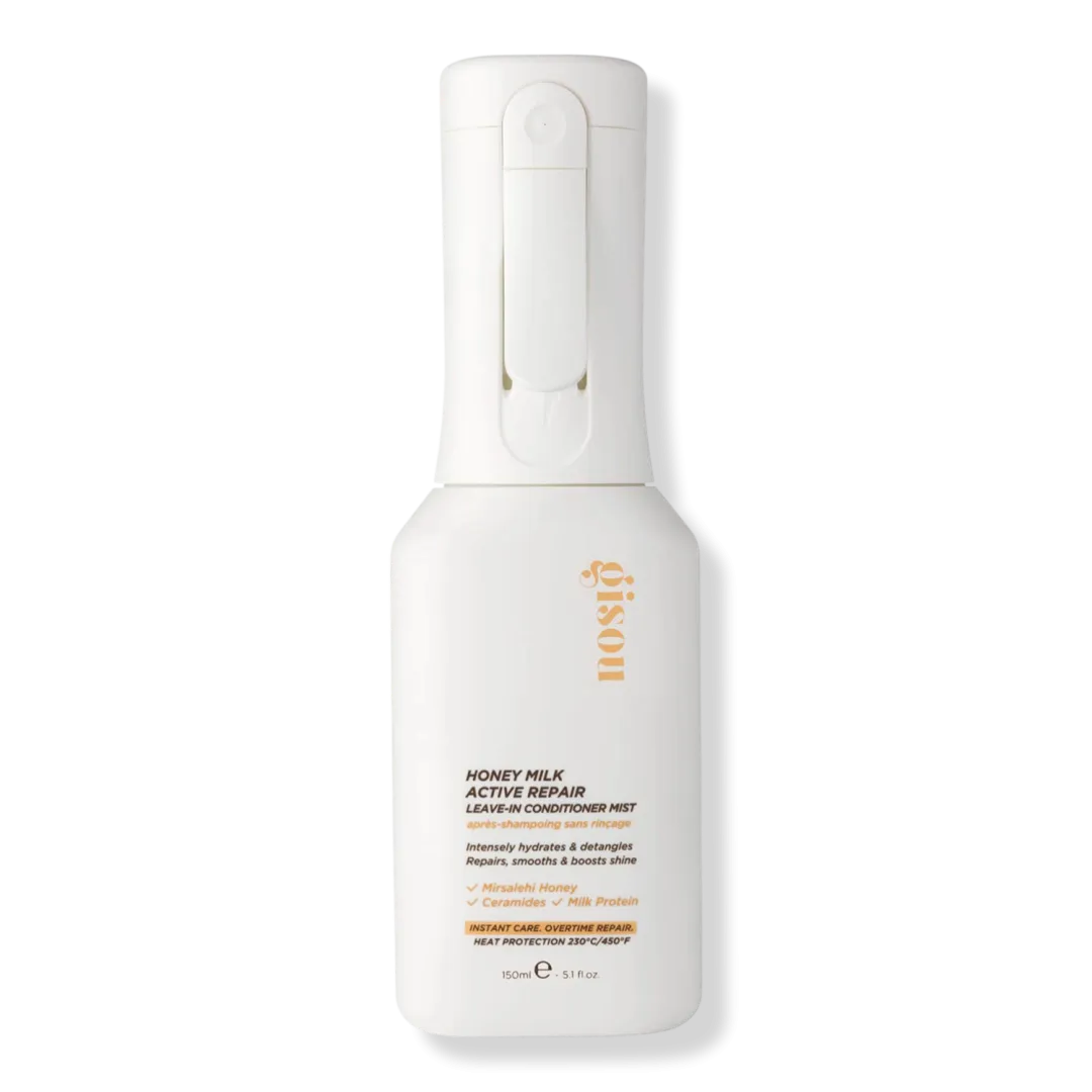 Спрей-кондиціонер без змивання на основі меду Мірсалехі, гідролізованих молочних протеїнів та церамідів, що відновлює, розплутує, розгладжує та захищає волосся при температурі до 450°F/230°C.
