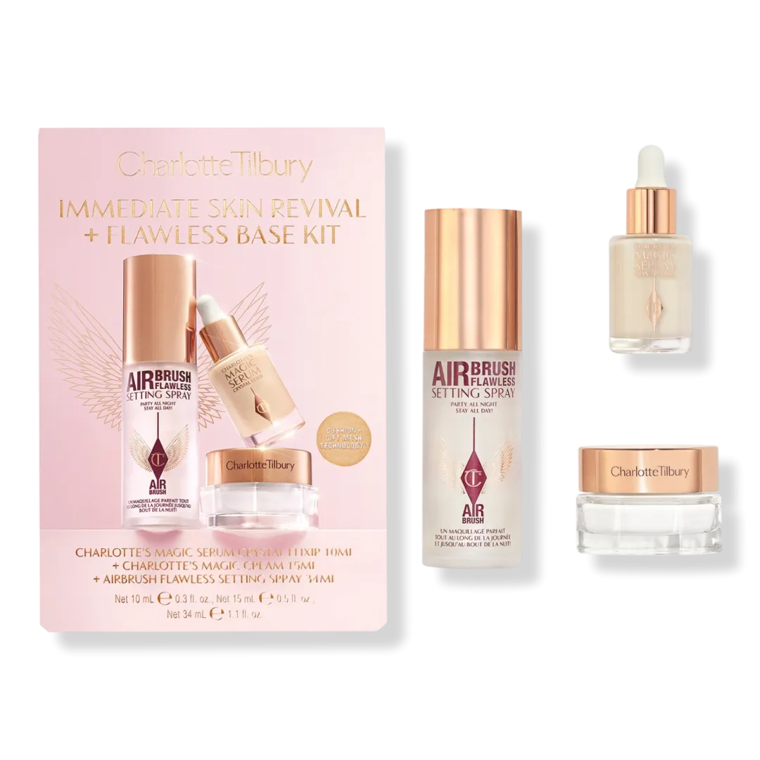 Набір Charlotte Immediate Skin Revival + Flawless Base Kit — це три готові до подорожі косметичні засоби у міні-форматі, які готують, зволожують та фіксують вигляд шкіри. Набір, що складається з Magic Serum Crystal Elixir, нового Magic Cream та Airbrush Flawless Setting Spray, допомагає отримати гладшу шкіру та стійкіший макіяж.