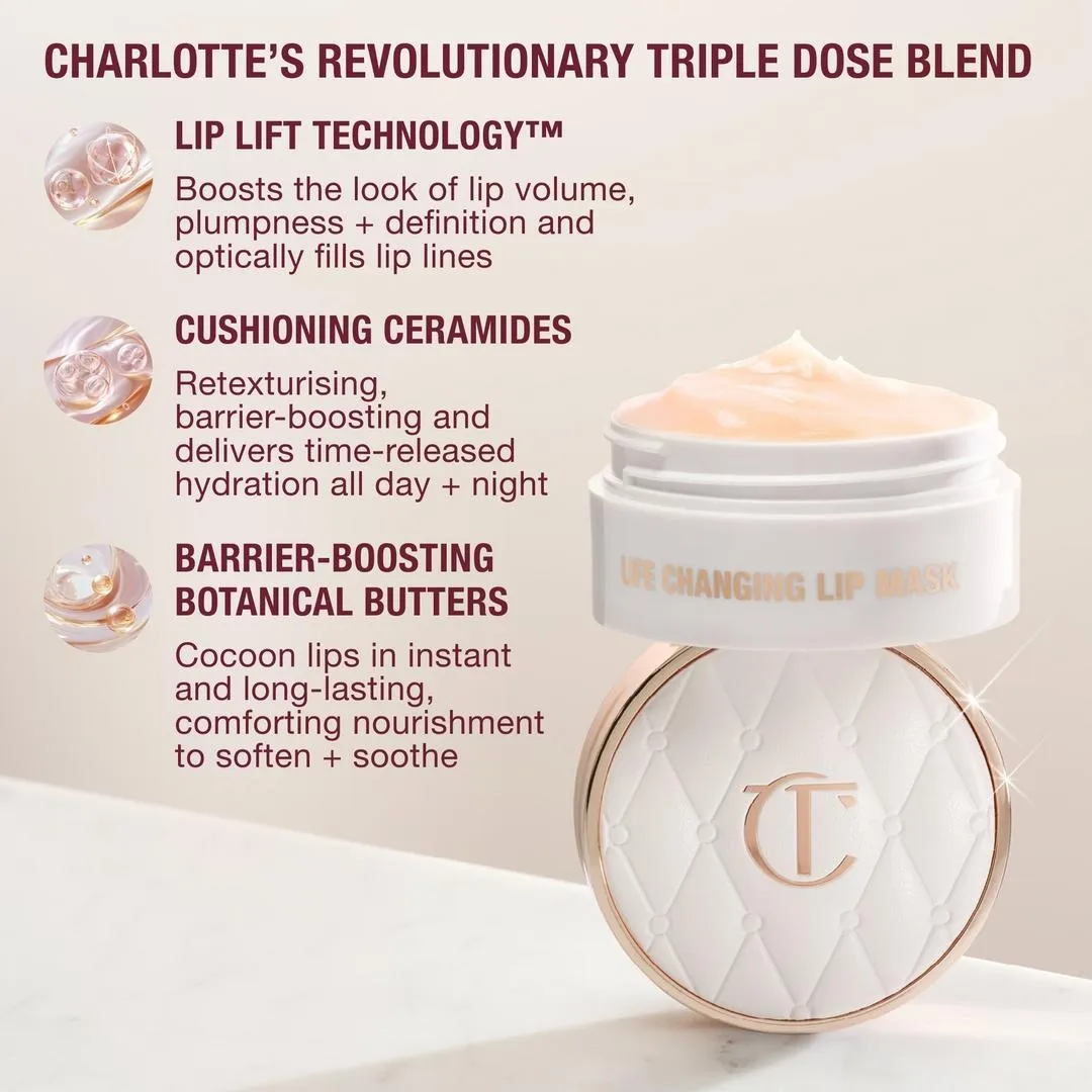Чудова зволожуюча маска для губ Life Changing Lip Mask з керамідами від Charlotte Tilbury тане на губах, глибоко живить, надає об'єм і відновлює їх, створюючи кашемірно-м'яку основу для легкого нанесення помади.