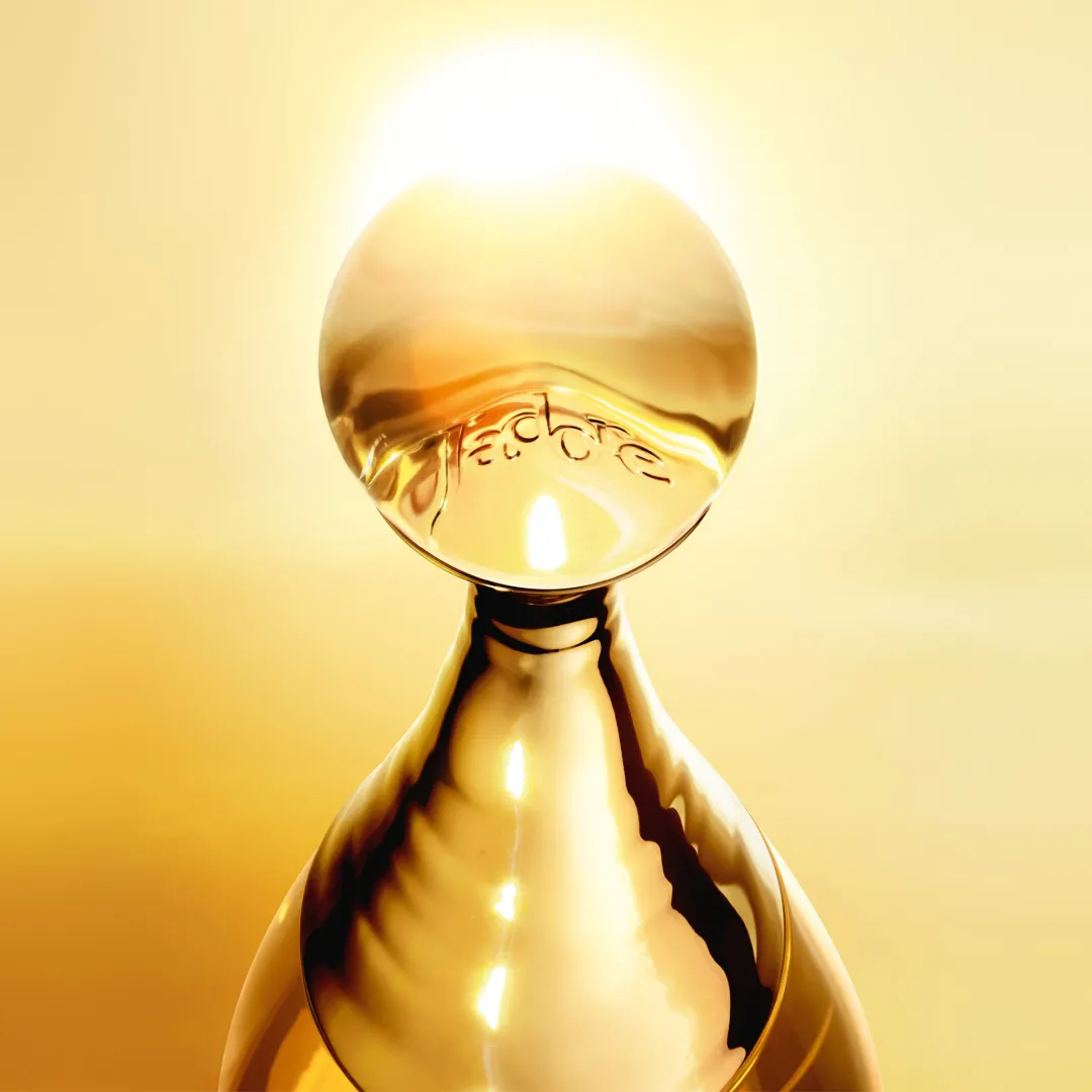 Повне округлості і вигинів, культове намисто J'adore було перероблено, щоб відобразити тепло аромату, перетворившись на органічний і дорогоцінний метал, який хвилюється і обіймає скло флакона L'Or de J'adore.