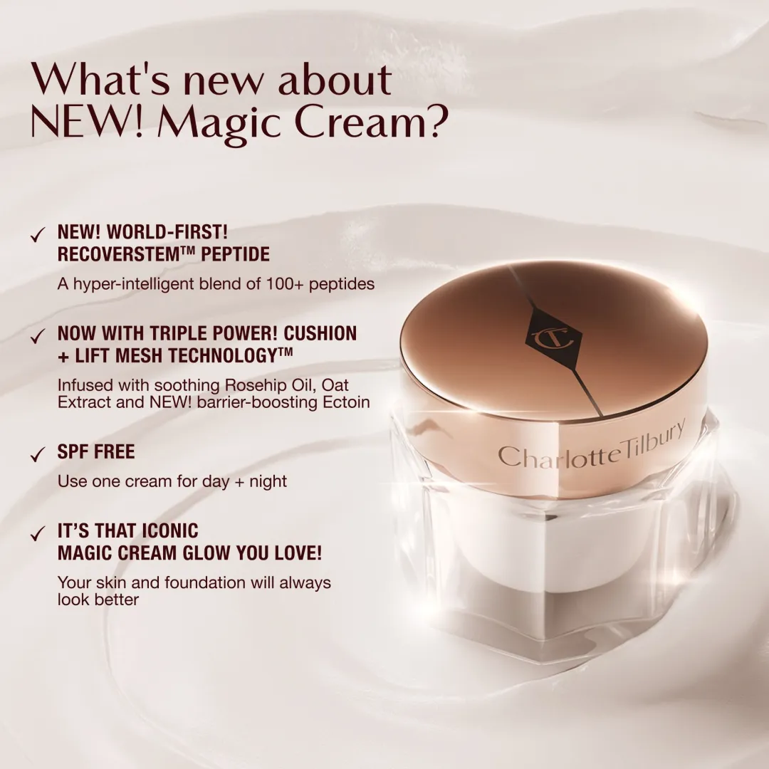Новий крем Charlotte’s Magic Cream, розроблений на основі революційного пептиду recoverstem™ із клінічно підтвердженою ефективністю, оновлює шкіру за 28 секунд і зменшує видимість 10 ознак старіння. Надзвичайно ефективна формула забезпечує улюблений, культовий блиск крему Magic Cream і миттєво закріплює макіяж: тональний крем завжди виглядатиме неймовірно і триматиметься довше, не осідаючи в дрібних зморшках.
