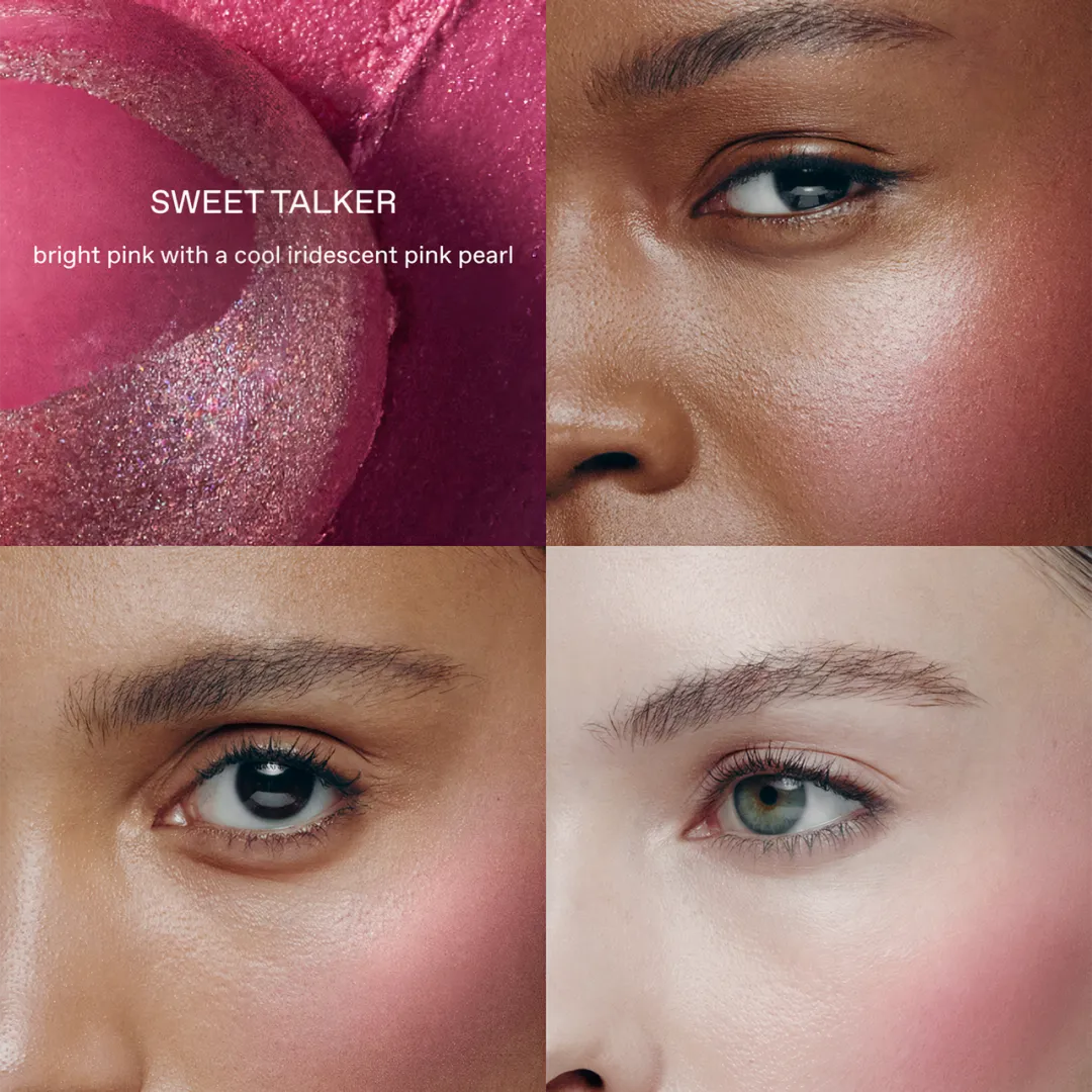 Мармурова суміш рум'ян і сяючих перлин-хайлайтерів тане на шкірі, створюючи бездоганний рум'янець, який підкреслюється світлом. Кремова формула легко наноситься і розтушовується, а зволожуючі антиоксиданти надають щокам яскравості та сяйва.