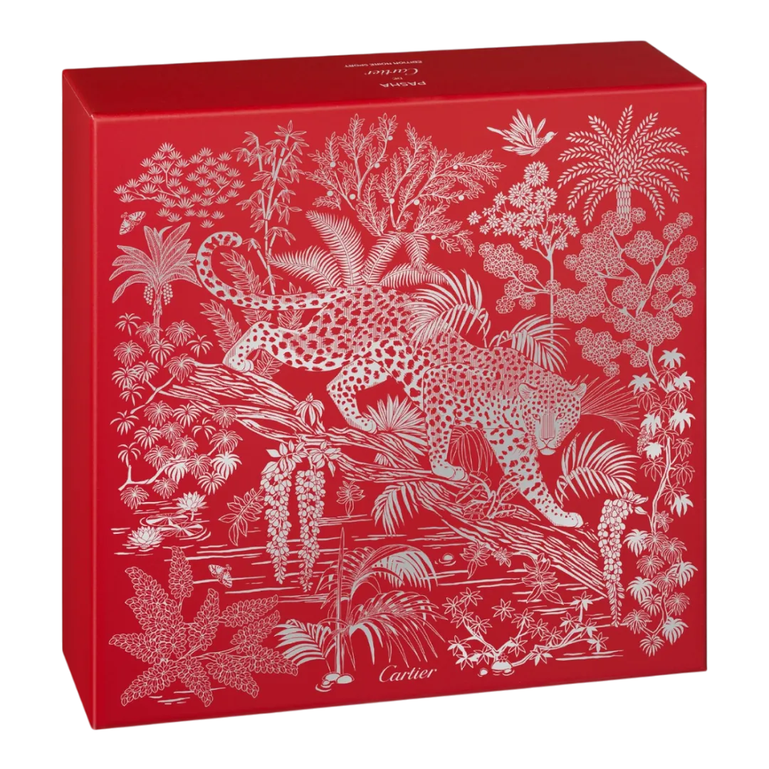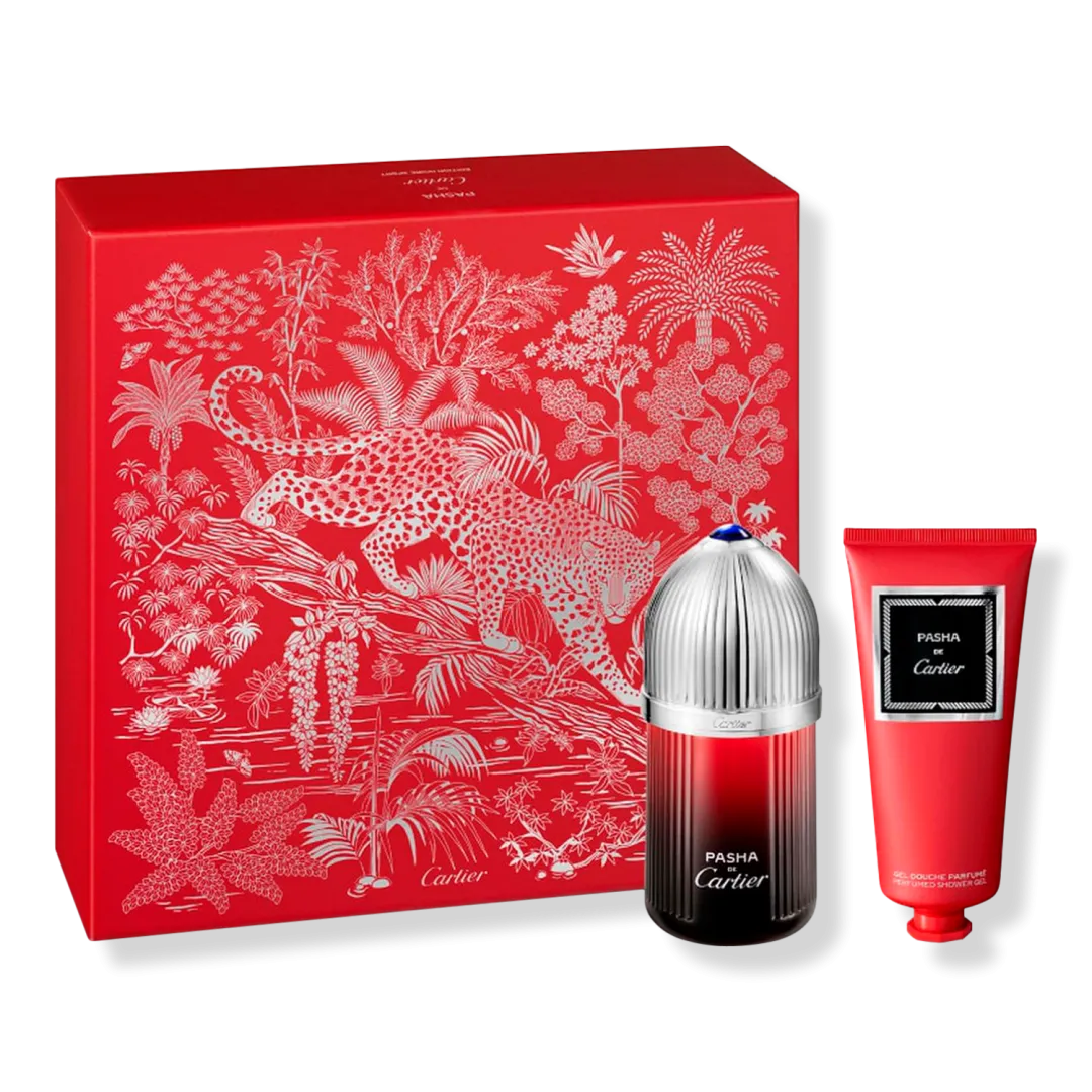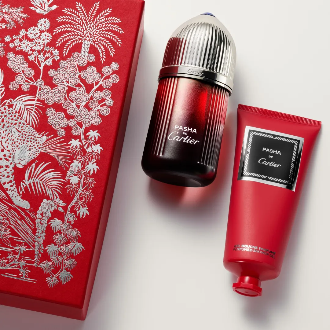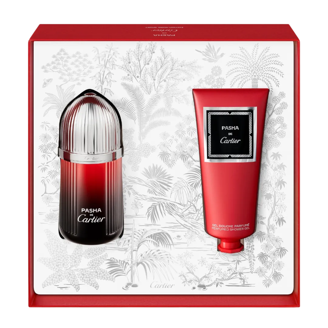 Подарунковий набір із святковим оформленням, натхненним кодами Cartier, що містить 100 мл туалетної води та 100 мл парфумованого гелю для душу з колекції Pasha de Cartier Édition Noire Sport.
