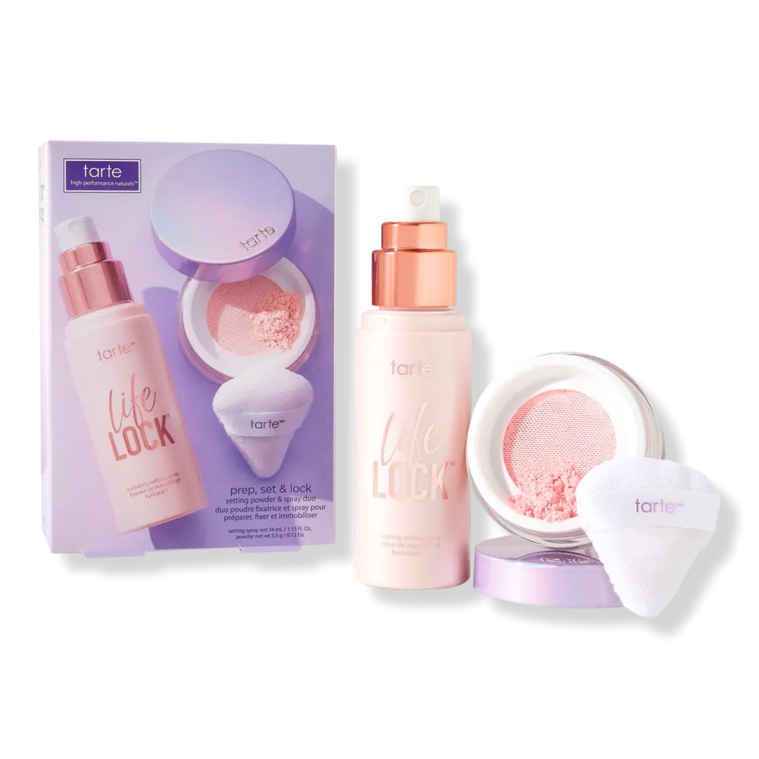 Пудра і спрей tarte™ prep, set & lock фіксують макіяж, забезпечуючи бездоганний вигляд з ранку до вечора.