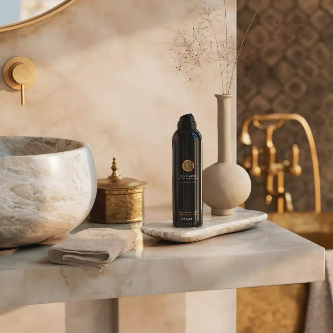 З першої колекції Rituals засобів для тіла Private Collection, Velvet Oudh Foaming Shower Gel — це розкішний гель для душу, що перетворюється на піну, з прекрасним ароматом. Аромат відкривається насиченим шафраном, переходить у серцевину троянди та закріплюється на базі розкішного уду.