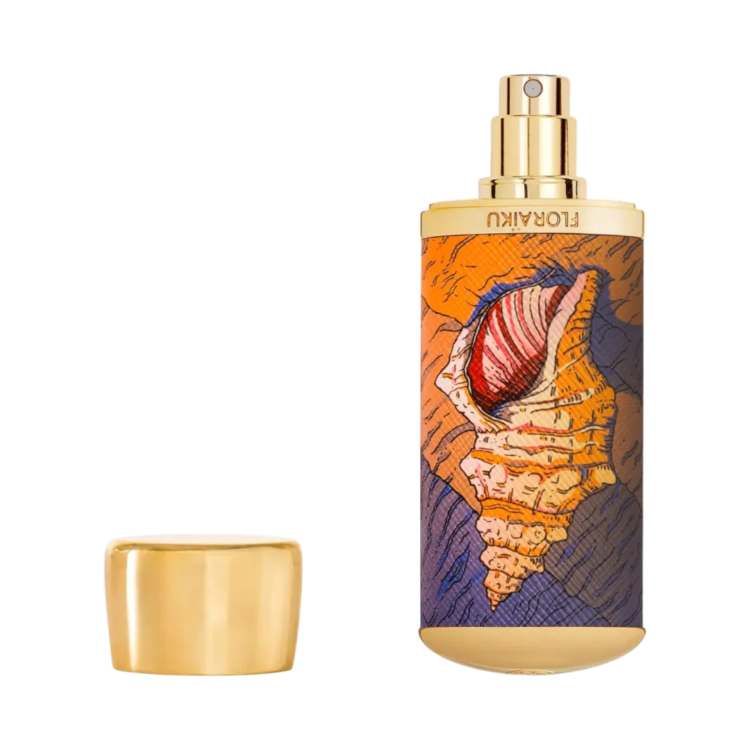 На пляжі вона сяє і привертає увагу, дотик і слух. На кришці пляшки з піском і шкірою цей мотив мушлі, друга берегів, також привертає увагу нюху і задоволення від відкриття сонячного і чуттєвого аромату. Теплі коричневі тони нагадують про кінець дня, коли сонце дарує вогняне видовище.
