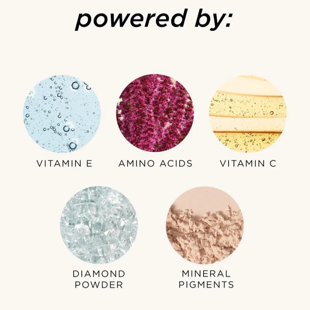 Ethylhexyl Palmitate, octyldodecanol, polyethylene, hydrogenated polyisobutene, phenyl trimethicone, acrylates crosspolymer, silica, octyldodecyl neopentanoate, methyl methacrylate crosspolymer, propylene glycol laurate, diamond powder, tocopherol, tocopheryl acetate, arginine, ascorbyl palmitate, microcrystalline wax/cera microcristallina/cire microcristalline, propylene carbonate, paraffin, caprylyl glycol, mica, disteardimonium hectorite, pentaerythrityl tetra-di-t-butyl hydroxyhydrocinnamate, polymethylsilsesquioxane. (+/-) Iron Oxides (CI 77491, CI 77492, CI 77499), titanium dioxide (CI 77891).