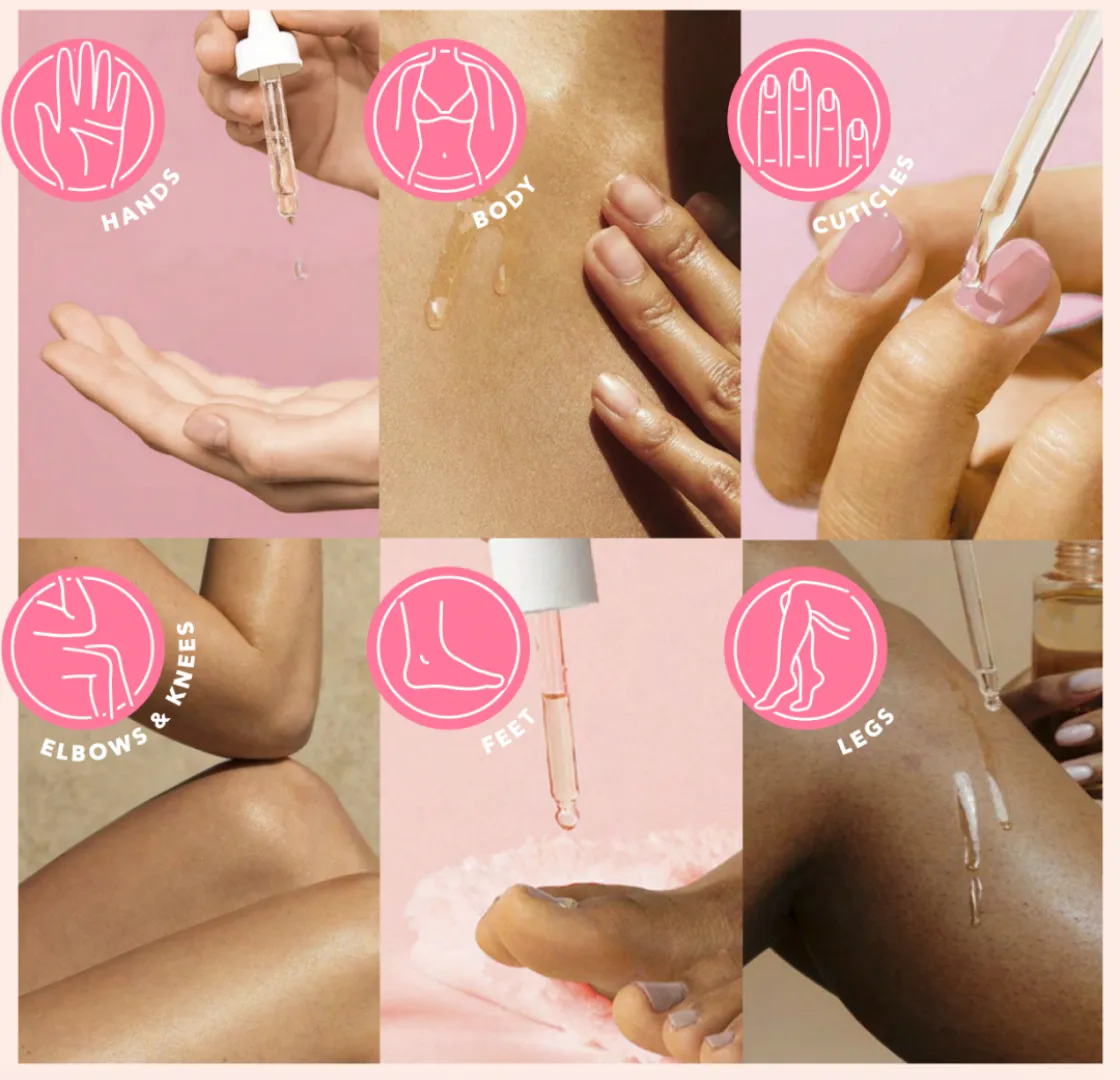 Нанесіть 1–2 краплі олійки за допомогою піпетки на бажану ділянку шкіри — кутикулу, руки, лікті, коліна, ступні або будь-яку зону, що потребує додаткового живлення.