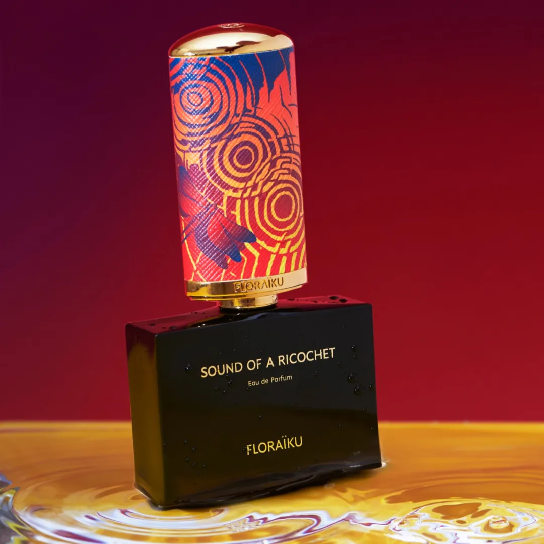 Червона бабка під палаючим небом, що з'являється в хайку парфуму, відбивається в золотому дзеркалі рикошетів. Сліди ідеальних кіл на поверхні води, що здаються такими чистими і ніжними, символізують структуру композиції.