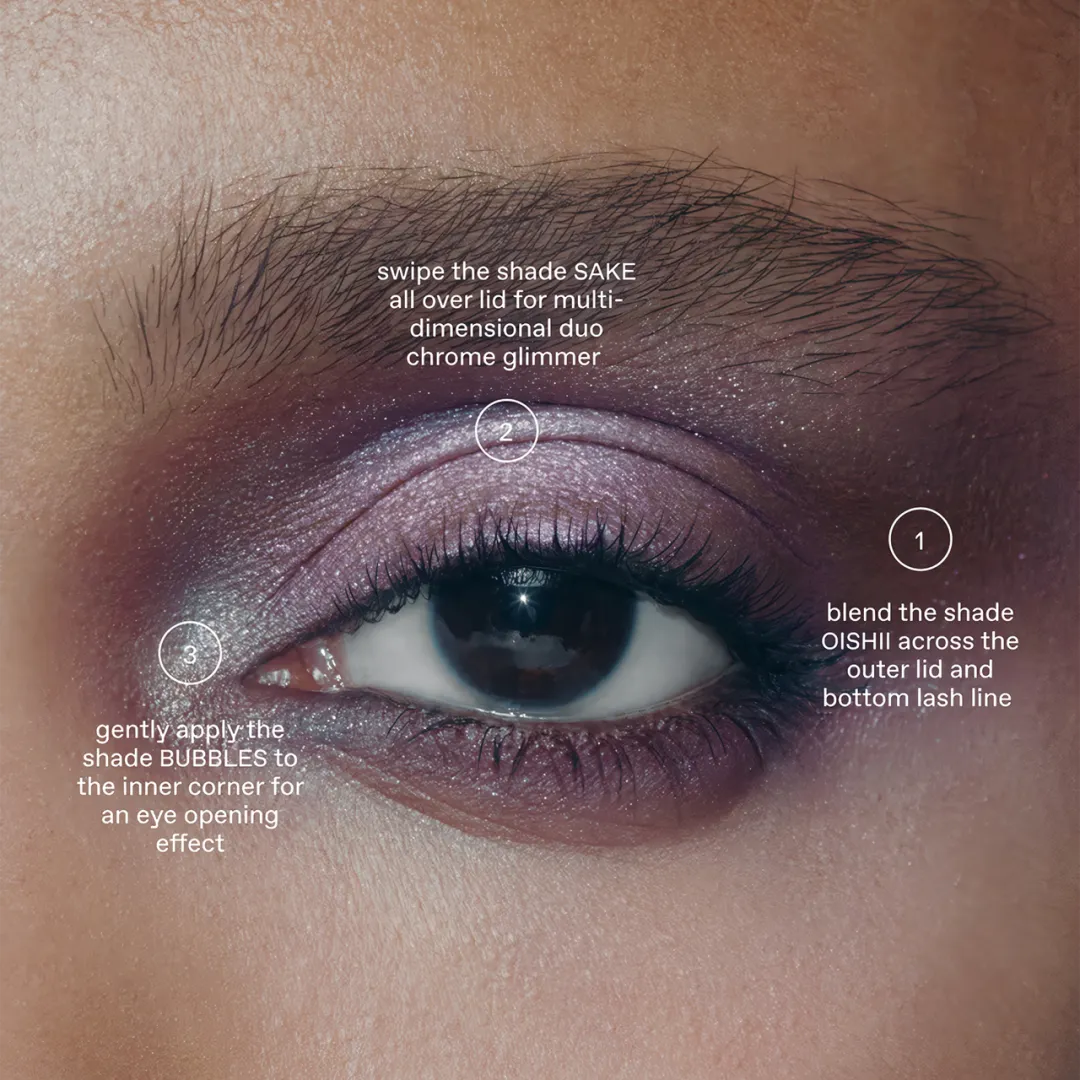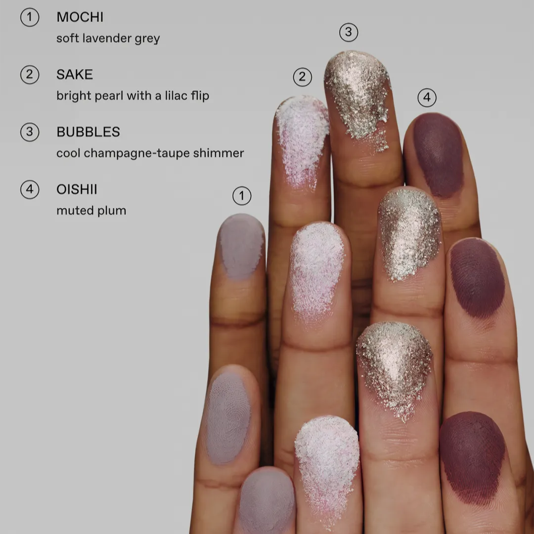 [Oishii, Mochi] Mica, Oryza Sativa (Rice) Powder, Silica, Magnesium Myristate, Cocoglycerides, Pentaerythrityl Tetraisostearate, Propanediol, Decylene Glycol, Butyrospermum Parkii (Shea) Butter, Magnesium Stearate, C10-18 Triglycerides, 1,2-Hexanediol, Lauroyl Lysine, Caprylhydroxamic Acid, +/- May Contain / Peut Contenir: Titanium Dioxide (CI 77891), Iron Oxides (CI 77491, CI 77499), Manganese Violet (CI 77742). [Bubbles] Mica, Calcium Aluminum Borosilicate, Hydrogenated Polyisobutene, Dimethicone, Zinc Stearate, Synthetic Fluorphlogopite, Silica, Trimethylsiloxysilicate, Ethylene/Propylene/Styrene Copolymer, Propanediol, Decylene Glycol, Tin Oxide, 1,2-Hexanediol, Butylene/Ethylene/Styrene Copolymer, Caprylhydroxamic Acid, Pentaerythrityl