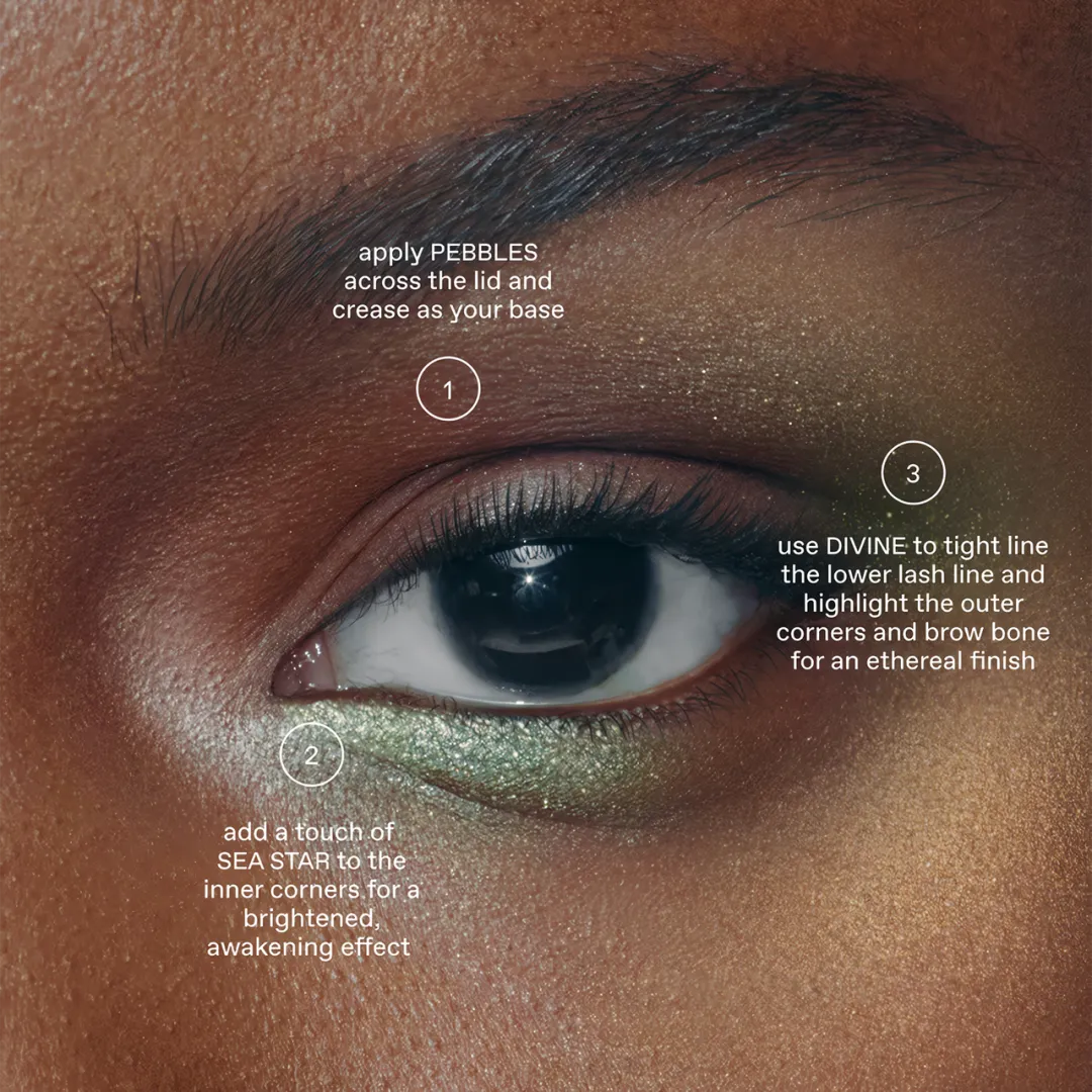 [Sea Star] Mica, Synthetic Fluorphlogopite, Silica, Hydrogenated Polyisobutene, Zinc Stearate, Dimethicone, Octyldodecyl Stearoyl Stearate, Tripelargonin, Iron Titanium Oxide, Ethylene/Propylene/Styrene Copolymer, Propanediol, Decylene Glycol, Dimethiconol, Lauroyl Lysine, Tin Oxide, 1,2-Hexanediol, Butylene/Ethylene/Styrene Copolymer, Caprylhydroxamic Acid, Pentaerythrityl Tetra-Di-T-Butyl Hydroxyhydrocinnamate, Titanium Dioxide (CI 77891), Iron Oxides (CI 77491, CI 77499). [Pebbles] Mica, Oryza Sativa (Rice) Powder, Silica, Magnesium Myristate, Cocoglycerides, Pentaerythrityl Tetraisostearate, Propanediol, Decylene Glycol, Butyrospermum Parkii (Shea) Butter, Magnesium Stearate, C10-18 Triglycerides, 1,2-Hexanediol, Lauroyl Lysine, Caprylhydroxamic Acid, Titanium Dioxide