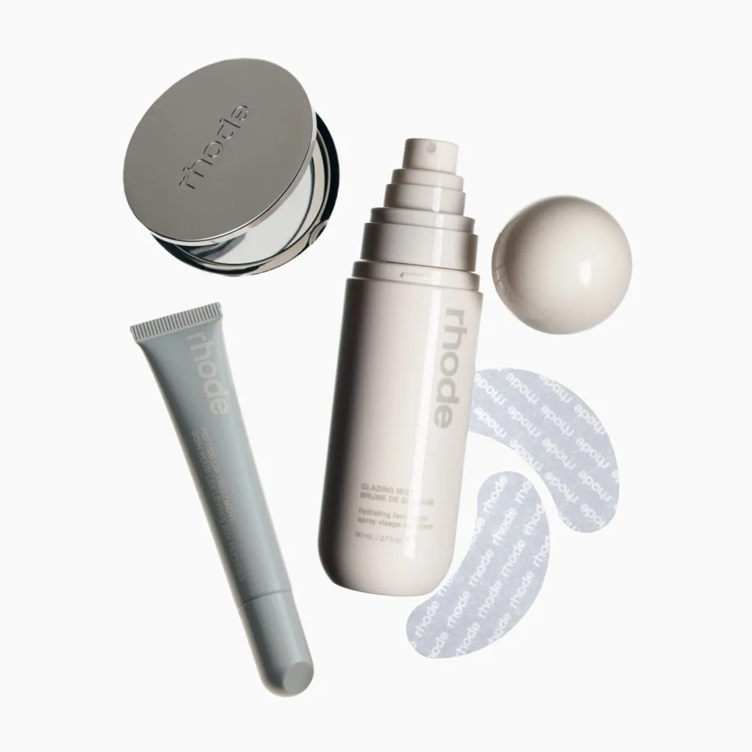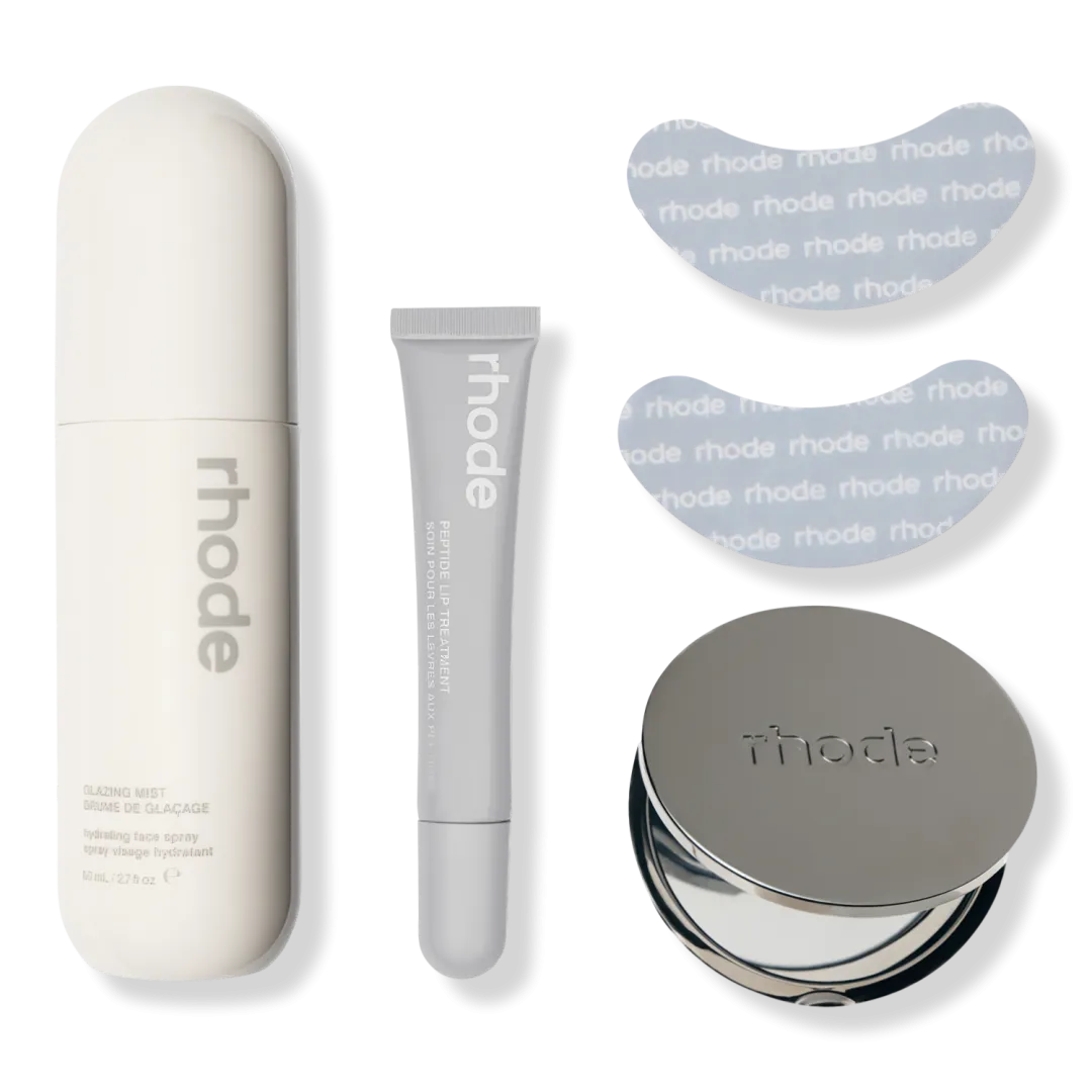 Включає 4 продукти: Glazing Mist, Peptide Eye Prep, Peptide Lip Treatment з ароматом на ваш вибір та дзеркало rhode.