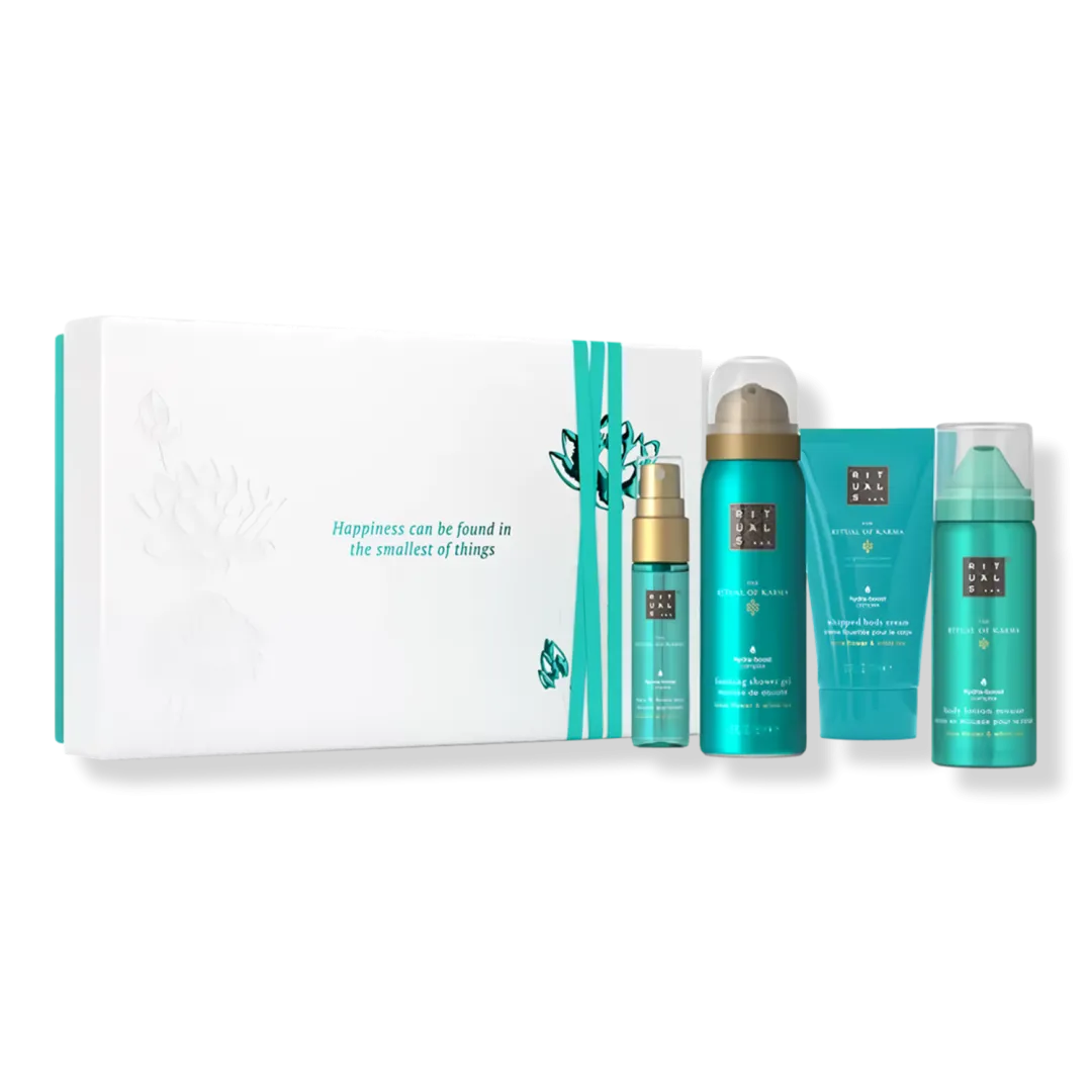 Відчуйте літній настрій у будь-яку пору року з The Ritual of Karma Small Gift Set. Усередині ви знайдете пінку для душу, крем для тіла, мус-лосьйон для тіла та міст для волосся й тіла. Завдяки поєднанню квітки лотоса та білого чаю, ця колекція дарує свіжість, сяйво та глибоке зволоження шкіри завдяки комплексу Hydra-Boost.