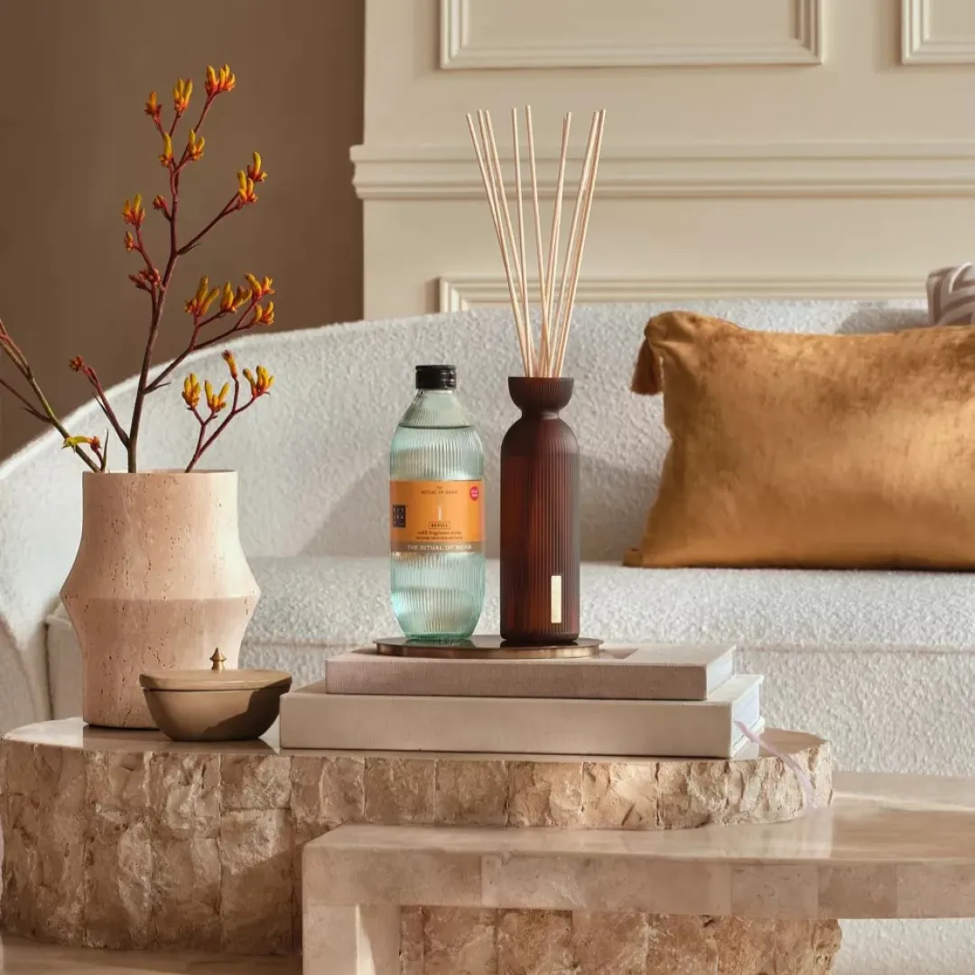 Ароматичні палички Ritual of Mehr — це натуральний і стильний спосіб наповнити ваш дім приємним ароматом. Після того як ви помістите палички в пляшку, вони почнуть природним і ніжним чином наповнювати кімнату ароматом кедра, солодкого апельсина і нотками теплих спецій. Цей розкішний аромат для дому ідеально підходить для використання в будь-якій кімнаті: від вітальні до ванної, кухні та спальні. Цей енергійний аромат протримається близько трьох місяців.