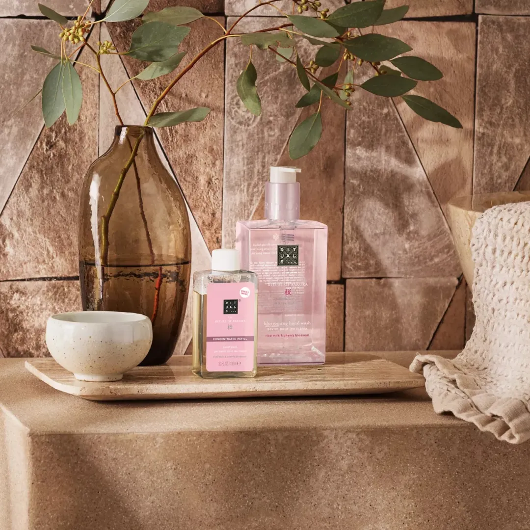 Перетворіть звичайну щоденну процедуру на приємний момент із ніжним рідким милом The Ritual of Sakura. Безмильна формула з рисовим молоком і квіткою вишні очищує та зволожує руки. Елегантно поєднайте його з кремом для рук з тієї ж серії на одній із наших стильних підносів. Також доступні наповнення (refill).