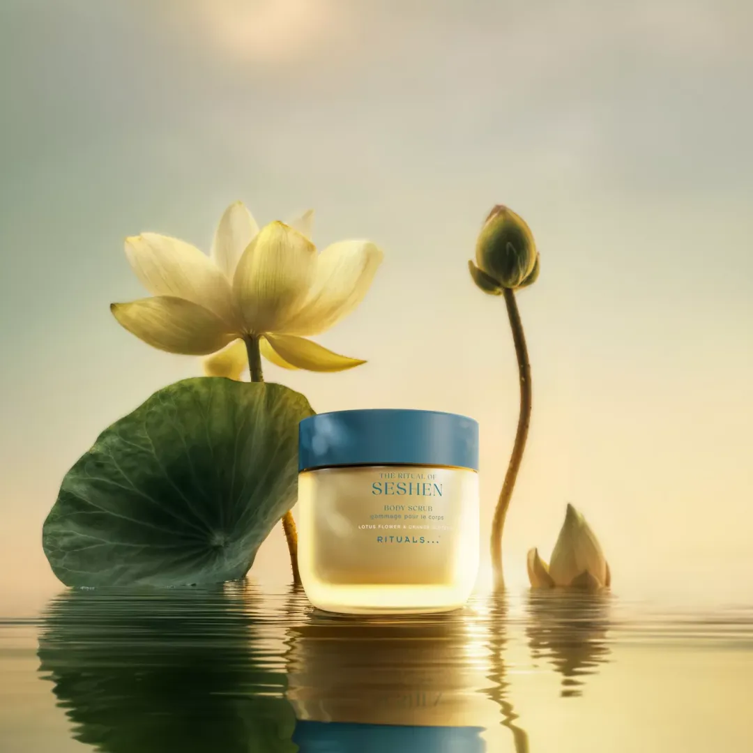 Натхненний щоденним відродженням квітки сешен, цей унікальний скраб з морською сіллю надихає на початок нового дня. Його особлива консистенція, що нагадує пісок, перетворюючись на легку молочну піну, відлущує шкіру, забезпечуючи її глибоке очищення та шовковисту гладкість. Завдяки вмісту гліцерину та бетаїну, що мають живильну дію, цей водянистий цитрусовий аромат з нотками лотоса переносить вас на освітлений сонцем берег Нілу. Відчуйте винятковий ефект, коли краплі води стікають по шкірі, залишаючи її зволоженою та готовою до нового дня.