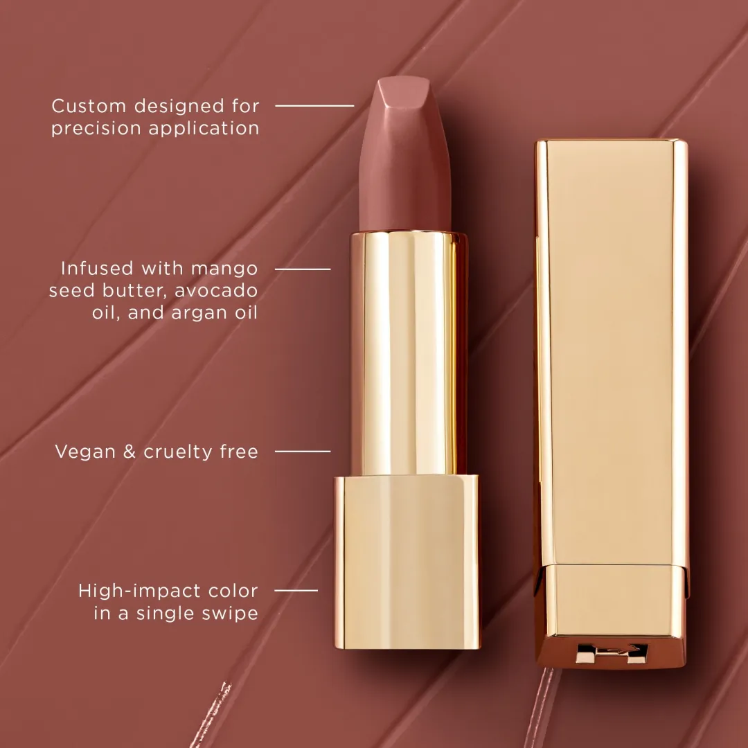 Відчуйте яскравий колір одним рухом завдяки цій ультразвожуючій помаді, яка забезпечує розкішне атласне кремове покриття. Кремова помада містить інноваційні веганські воски, які забезпечують гладку текстуру, що легко наноситься і миттєво тане на губах. Формула, збагачена маслом насіння манго, маслом авокадо та маслом аргана, доглядає за губами, роблячи їх м'якими та гладкими, а також забезпечує комфортне носіння, яке відчувається справді невагомим. Спеціальна форма помади дозволяє наносити її точно.