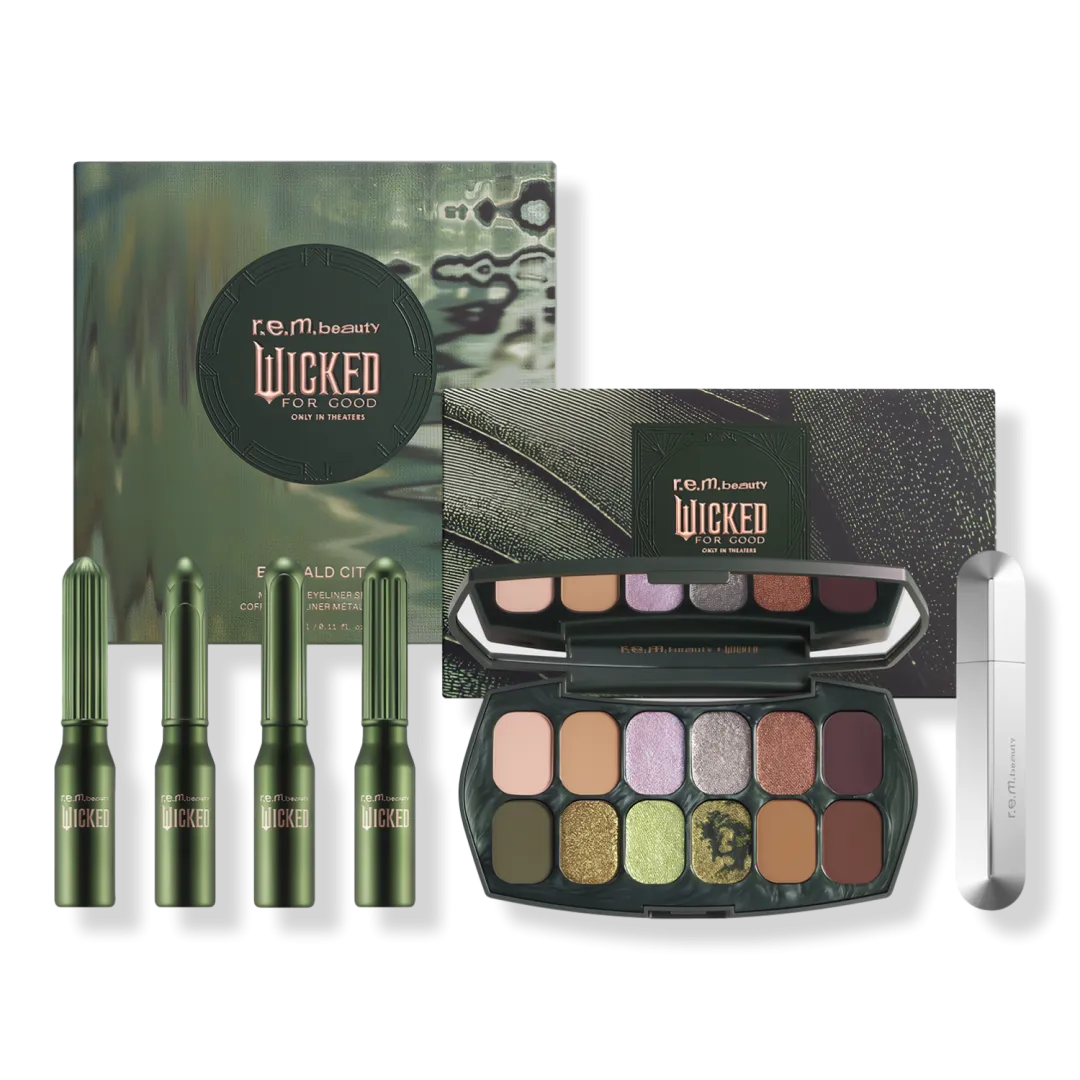 r.e.m. beauty x Wicked: For Good Ozian Forest Eyeshadow Palette та Emerald City Metallic Eyeliner Set, плюс безкоштовний подарунок — фірмова Flourishing Lengthening Mascara, щоб створити чарівний погляд.