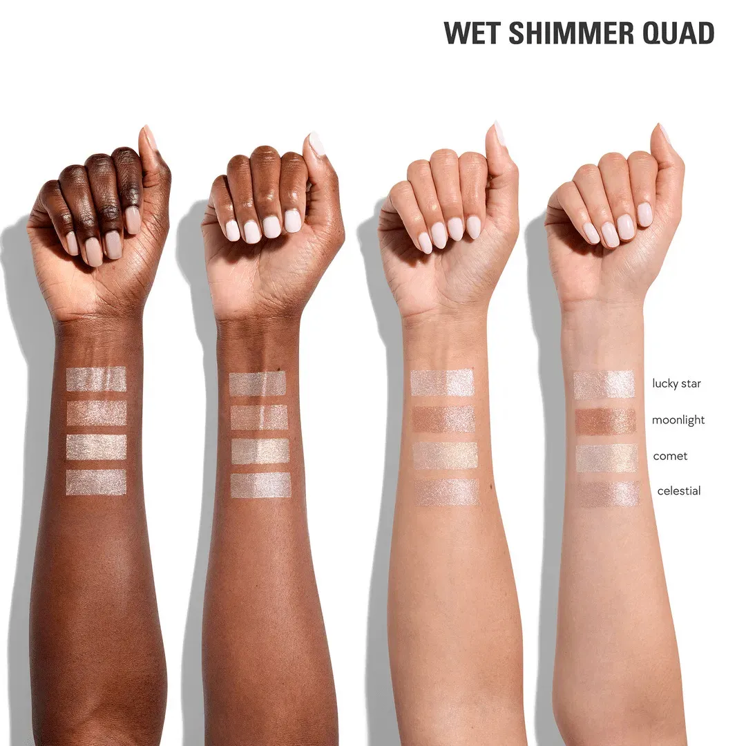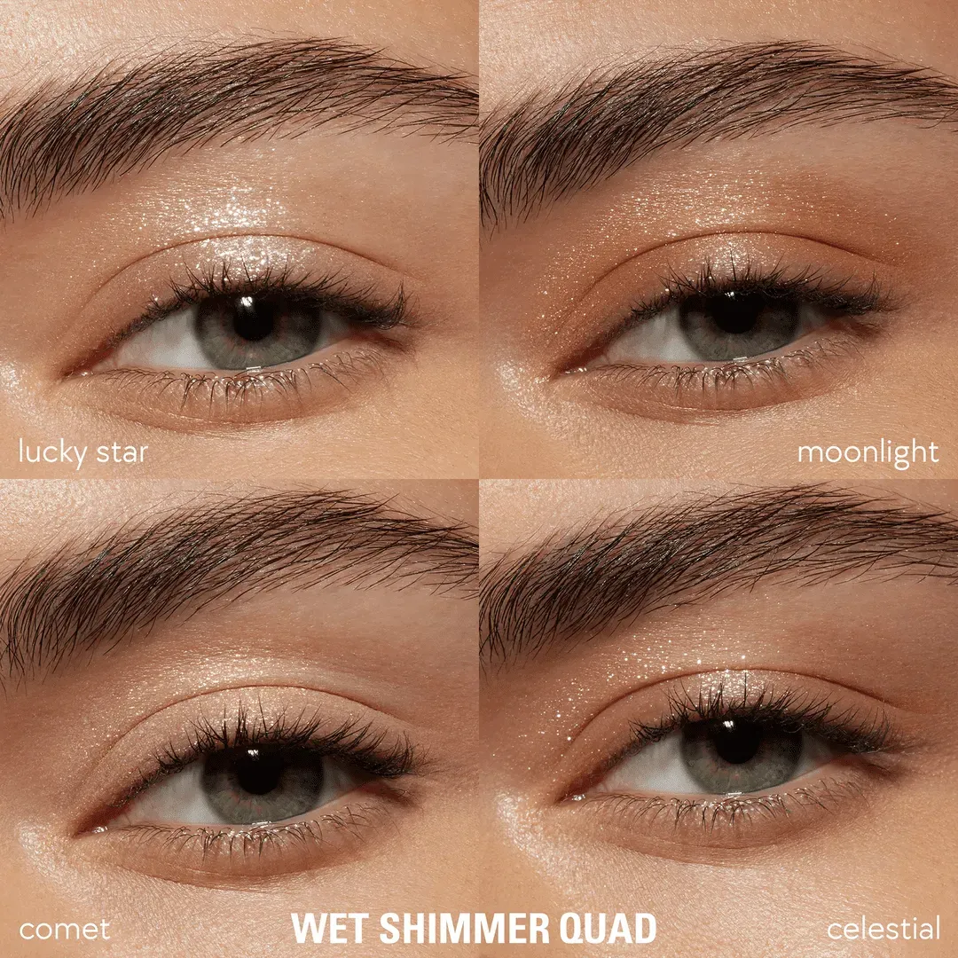 За допомогою цієї нової, лімітованої серії Wet Shimmer Quad отримайте сяючий погляд з вологим, світловідбиваючим блиском. Ці формули, що легко наносяться та чудово розтушовуються, пропонують яскраві кольори та містять перлинки, що відбивають світло, які підкреслюють та надають об'ємності очам.
